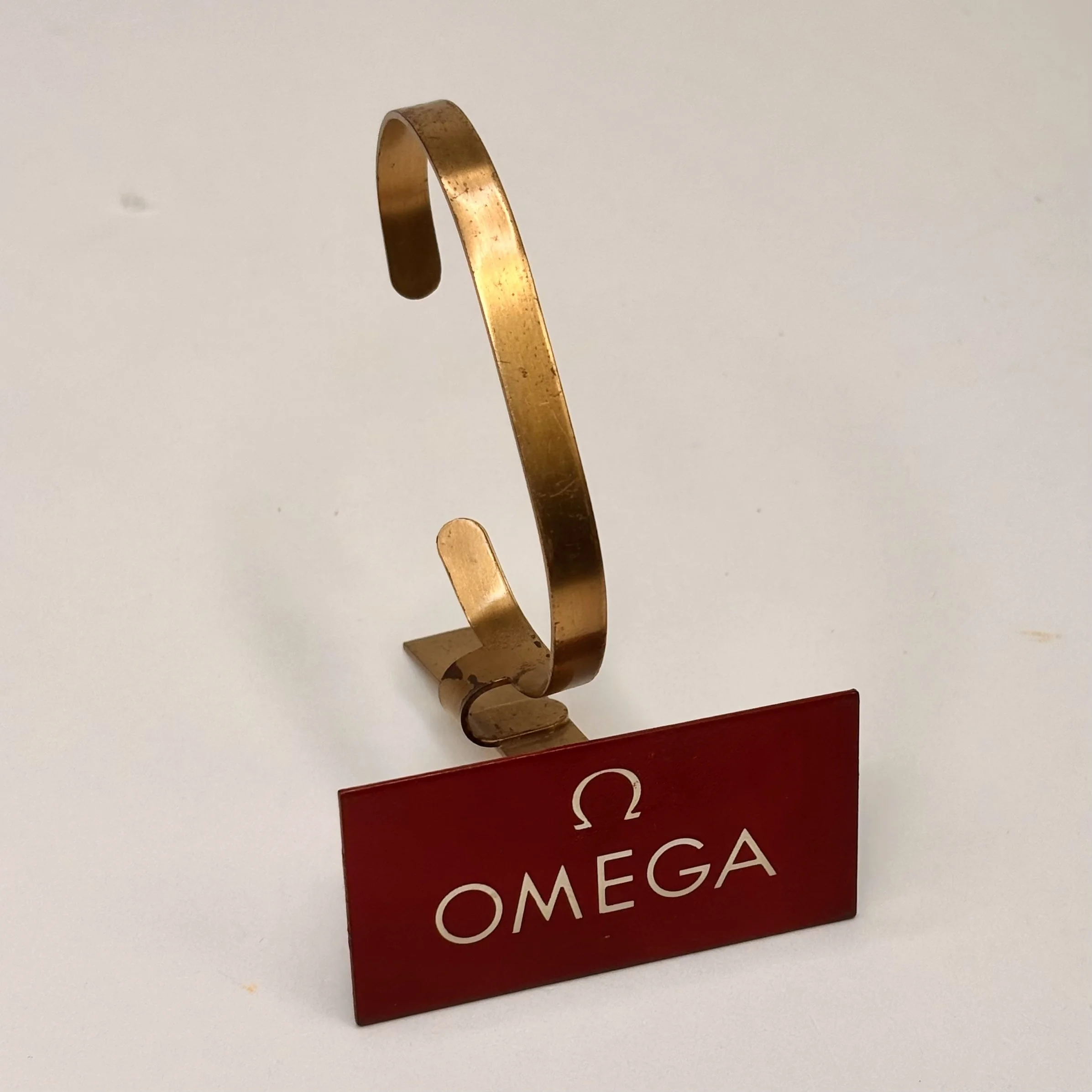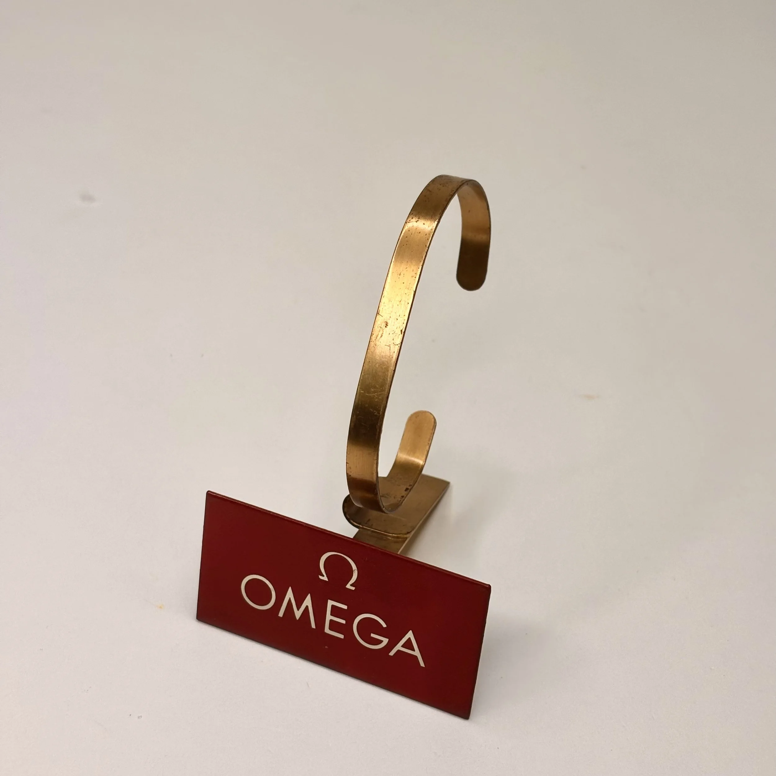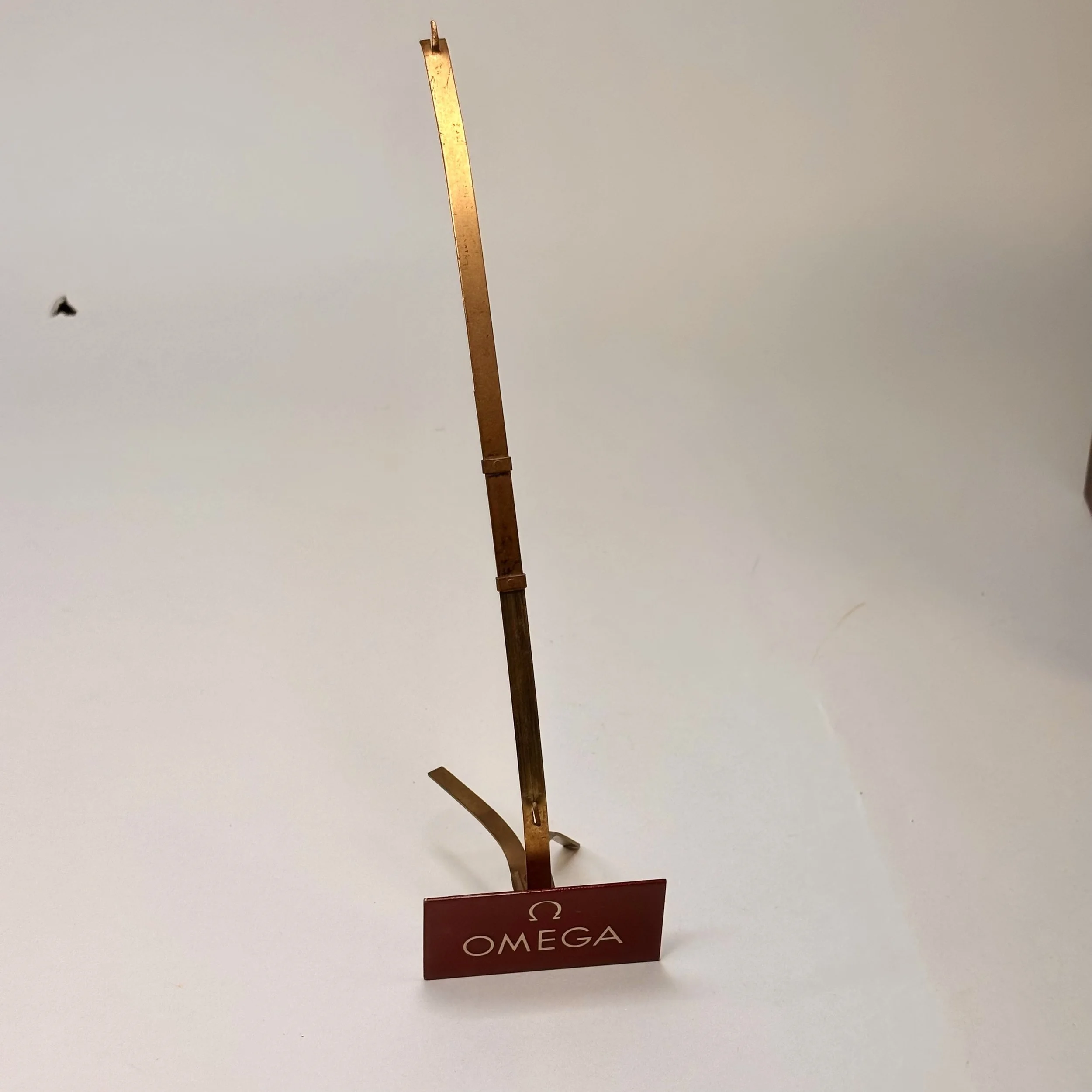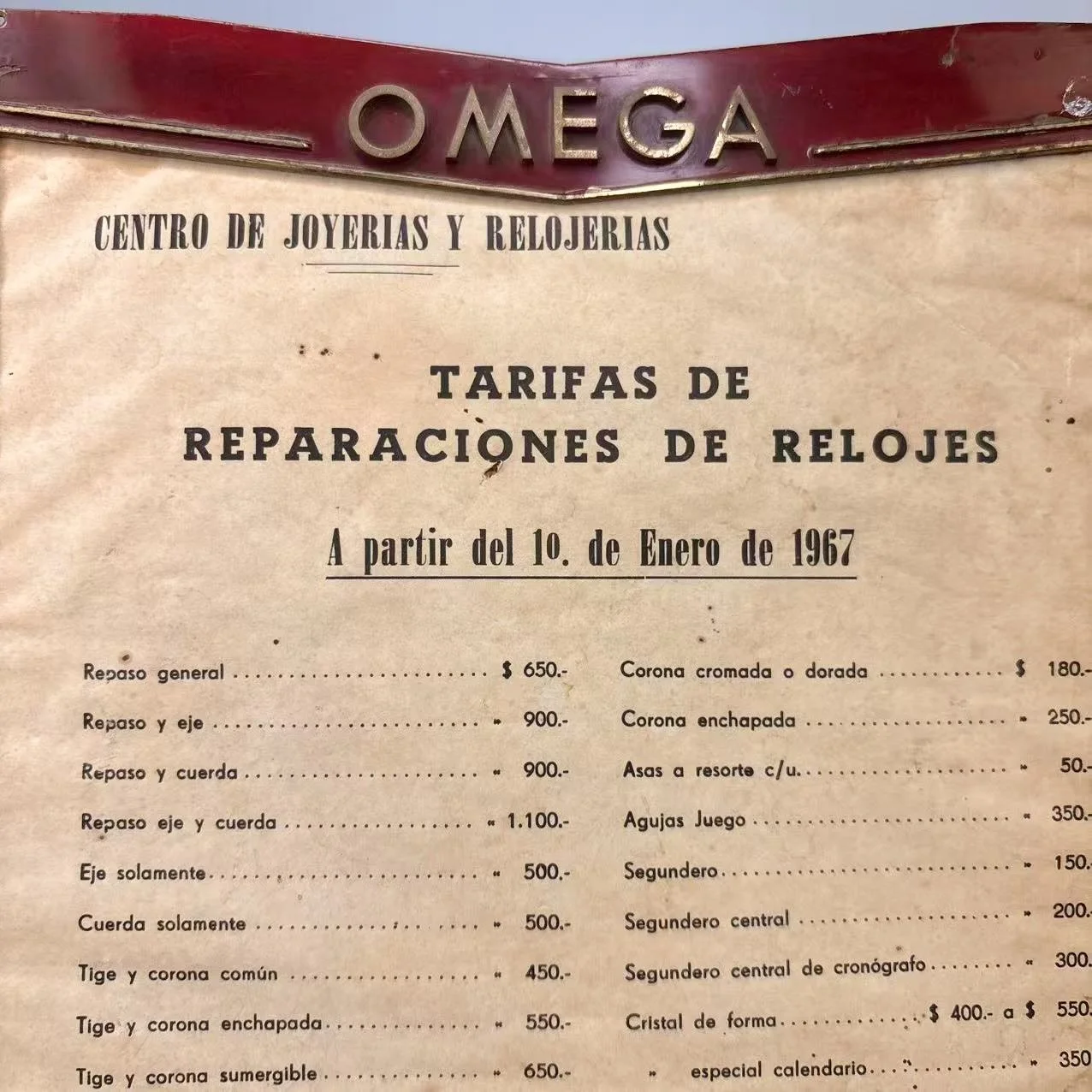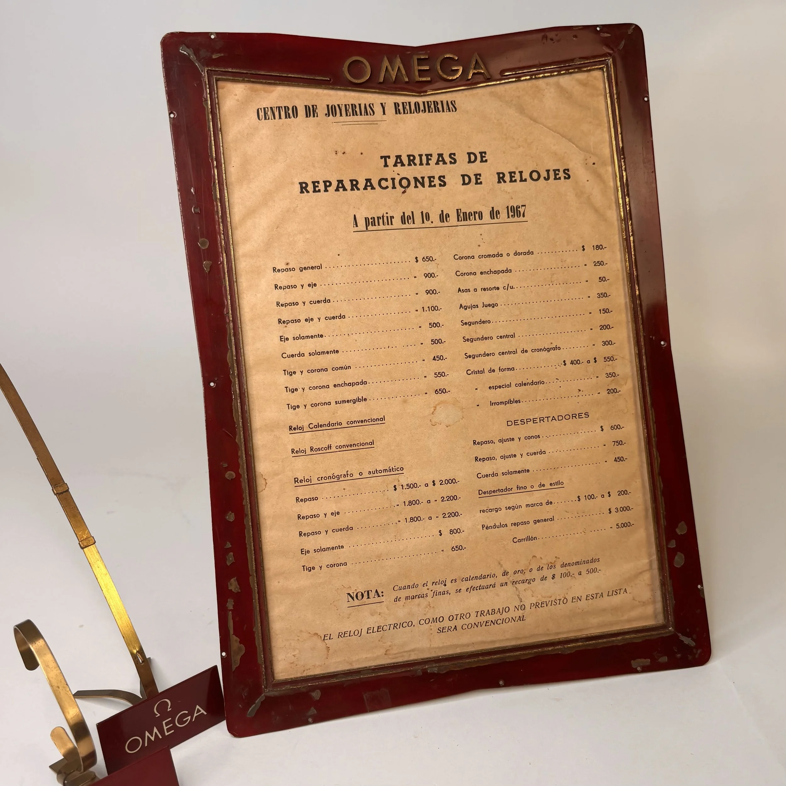 This Omega Golden Era Watch Display Ensemble – 1967 Service List Edition includes a rare Spanish-language service tariff sheet and two original Omega watch display stands. The main sign is framed in red enamel and gold-toned trim, prominently featuring the iconic Omega logo in raised metallic lettering. The printed list details official watch repair rates starting from January 10, 1967, highlighting Omega’s historical pricing for timepieces and parts. Accompanying the signage are two gold-tone metal stands with red Omega logo bases, designed to showcase wristwatches—one with a classic loop form and the other an extended, adjustable height variant, both evoking mid-century retail aesthetics.