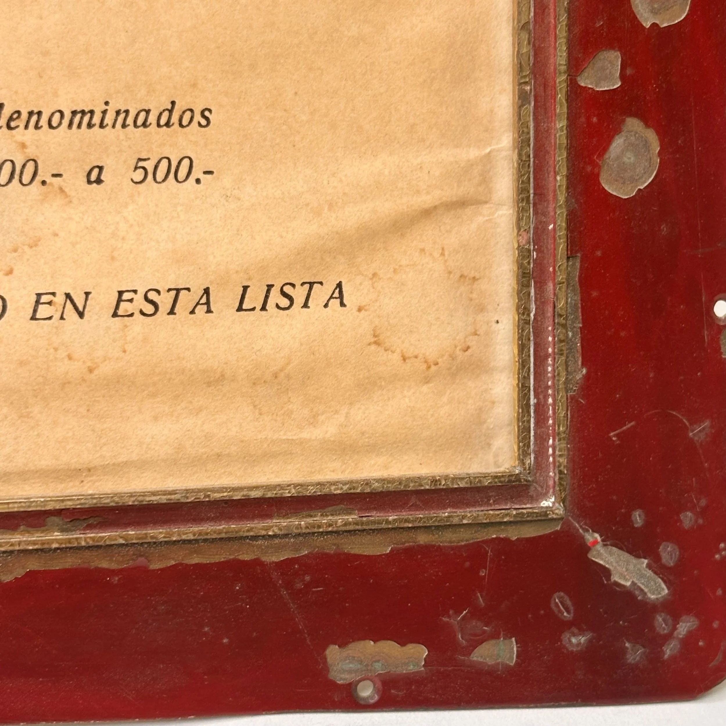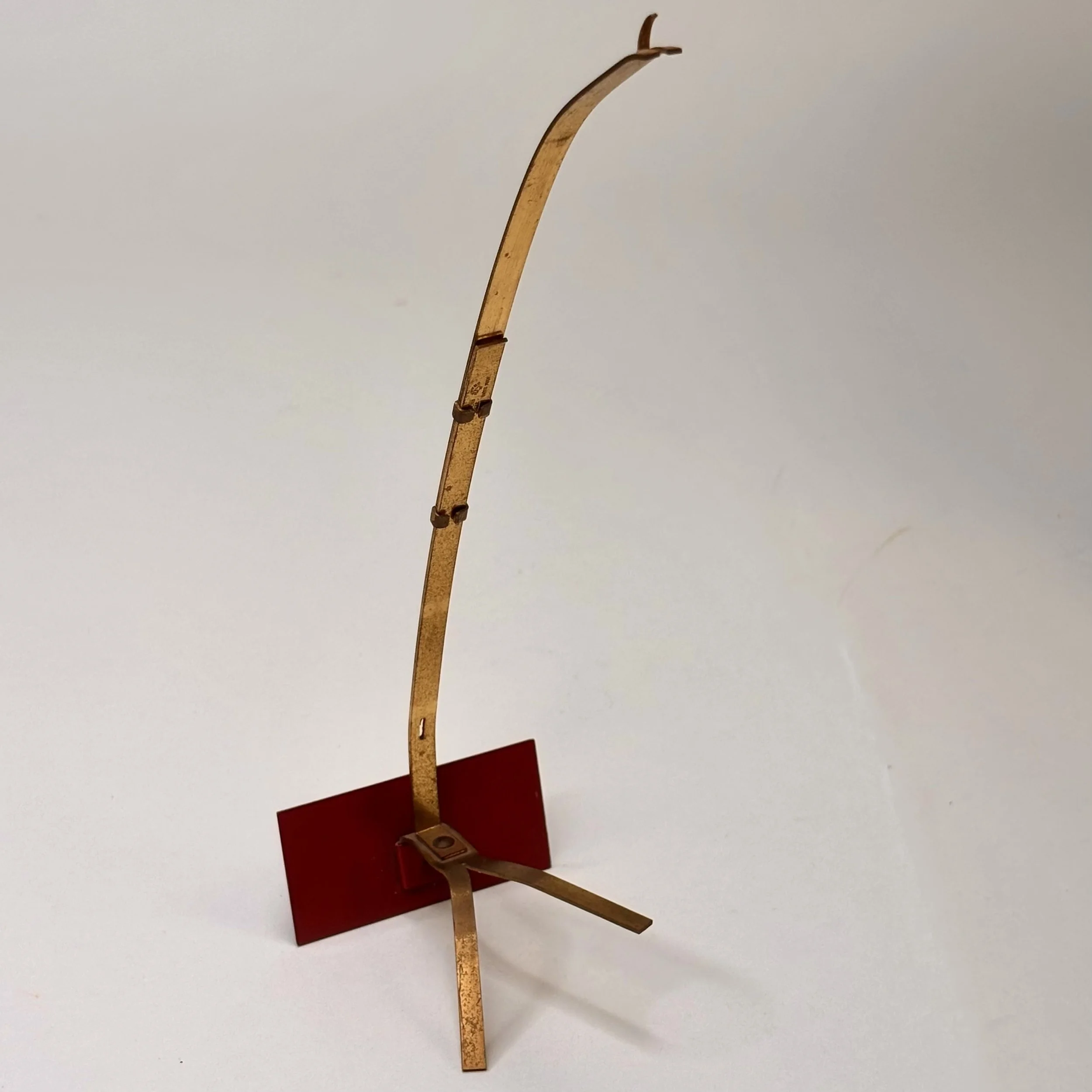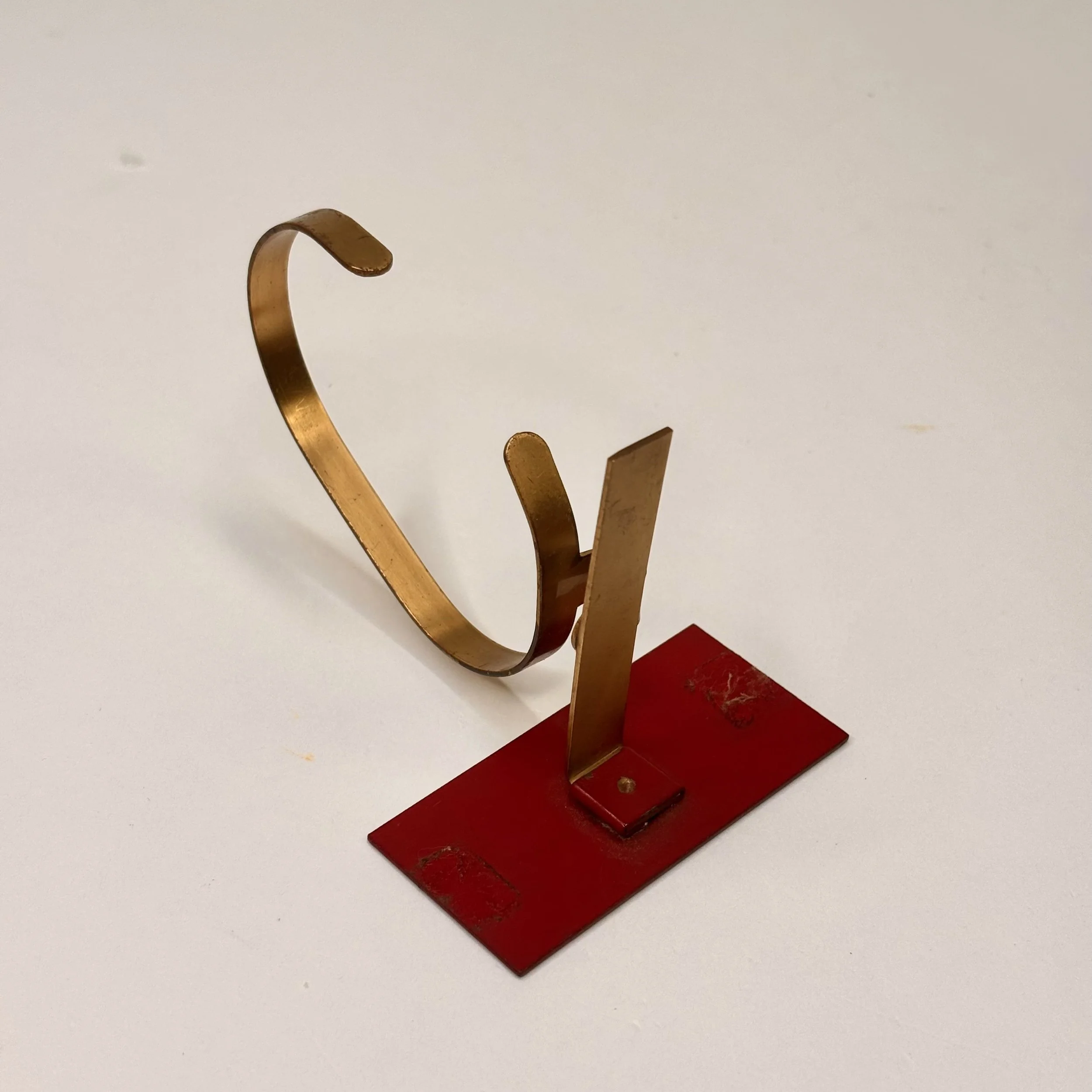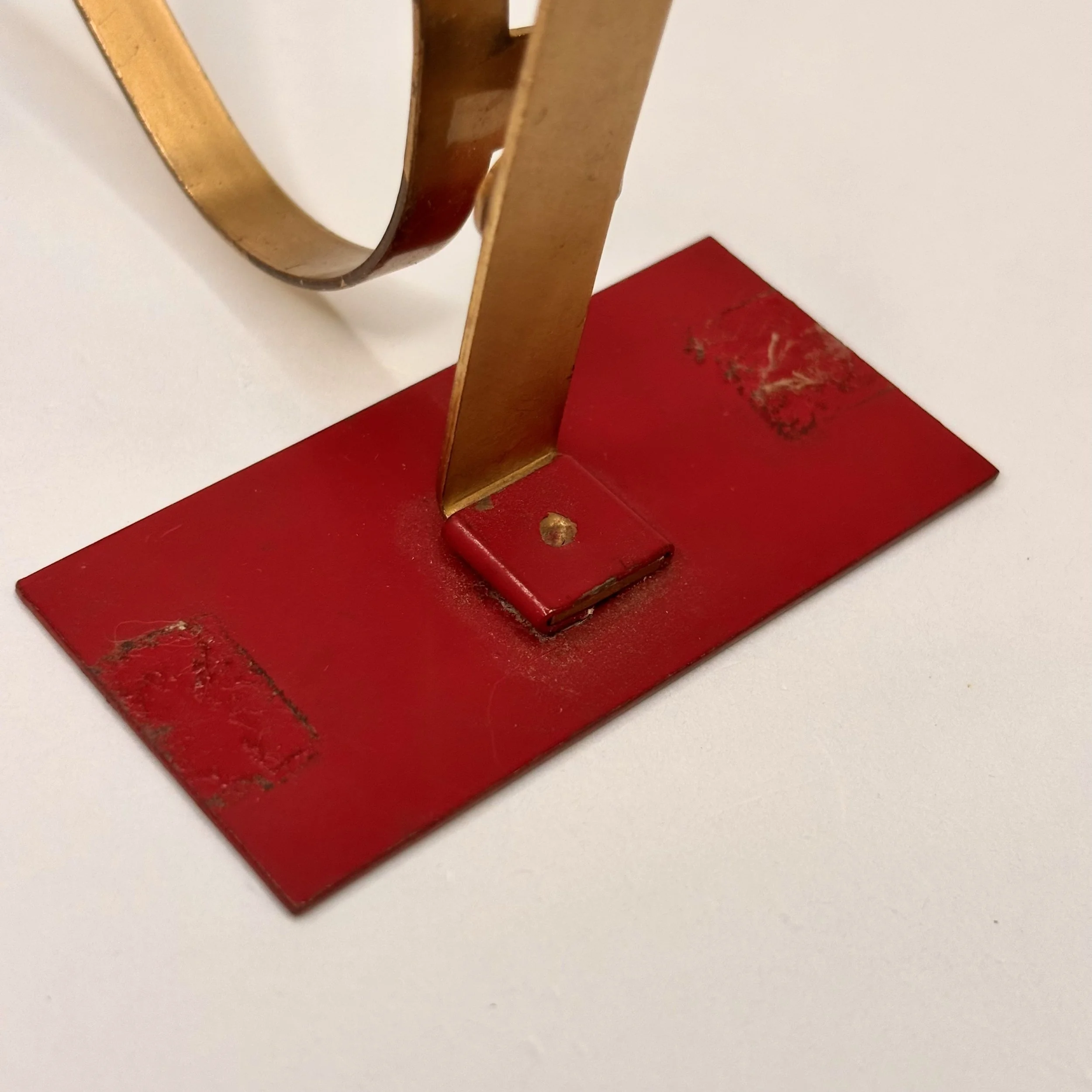 This Omega Golden Era Watch Display Ensemble – 1967 Service List Edition includes a rare Spanish-language service tariff sheet and two original Omega watch display stands. The main sign is framed in red enamel and gold-toned trim, prominently featuring the iconic Omega logo in raised metallic lettering. The printed list details official watch repair rates starting from January 10, 1967, highlighting Omega’s historical pricing for timepieces and parts. Accompanying the signage are two gold-tone metal stands with red Omega logo bases, designed to showcase wristwatches—one with a classic loop form and the other an extended, adjustable height variant, both evoking mid-century retail aesthetics.