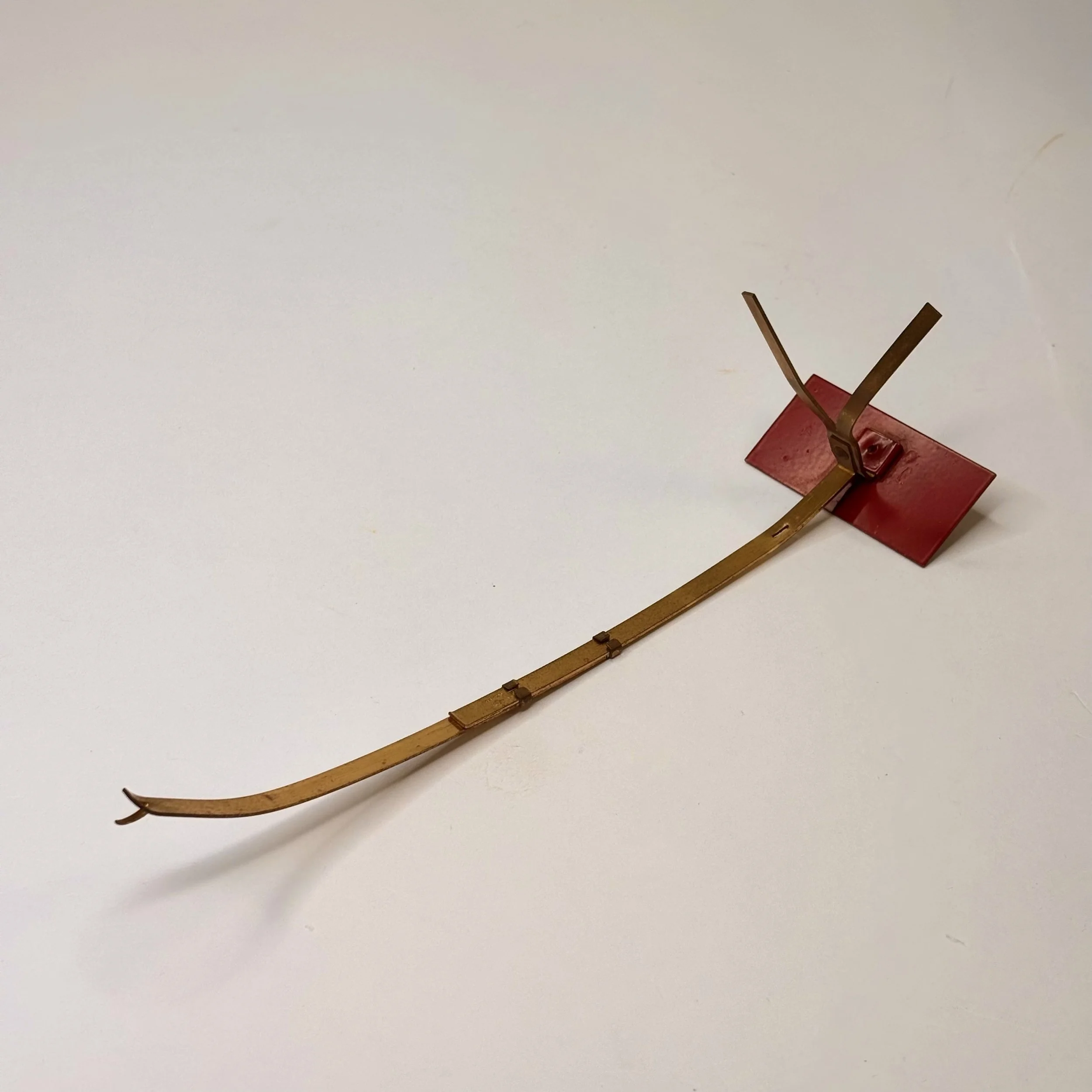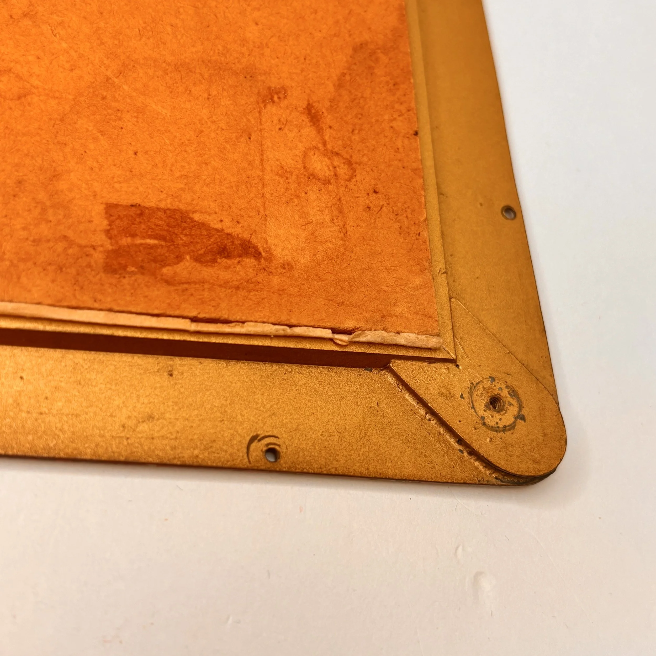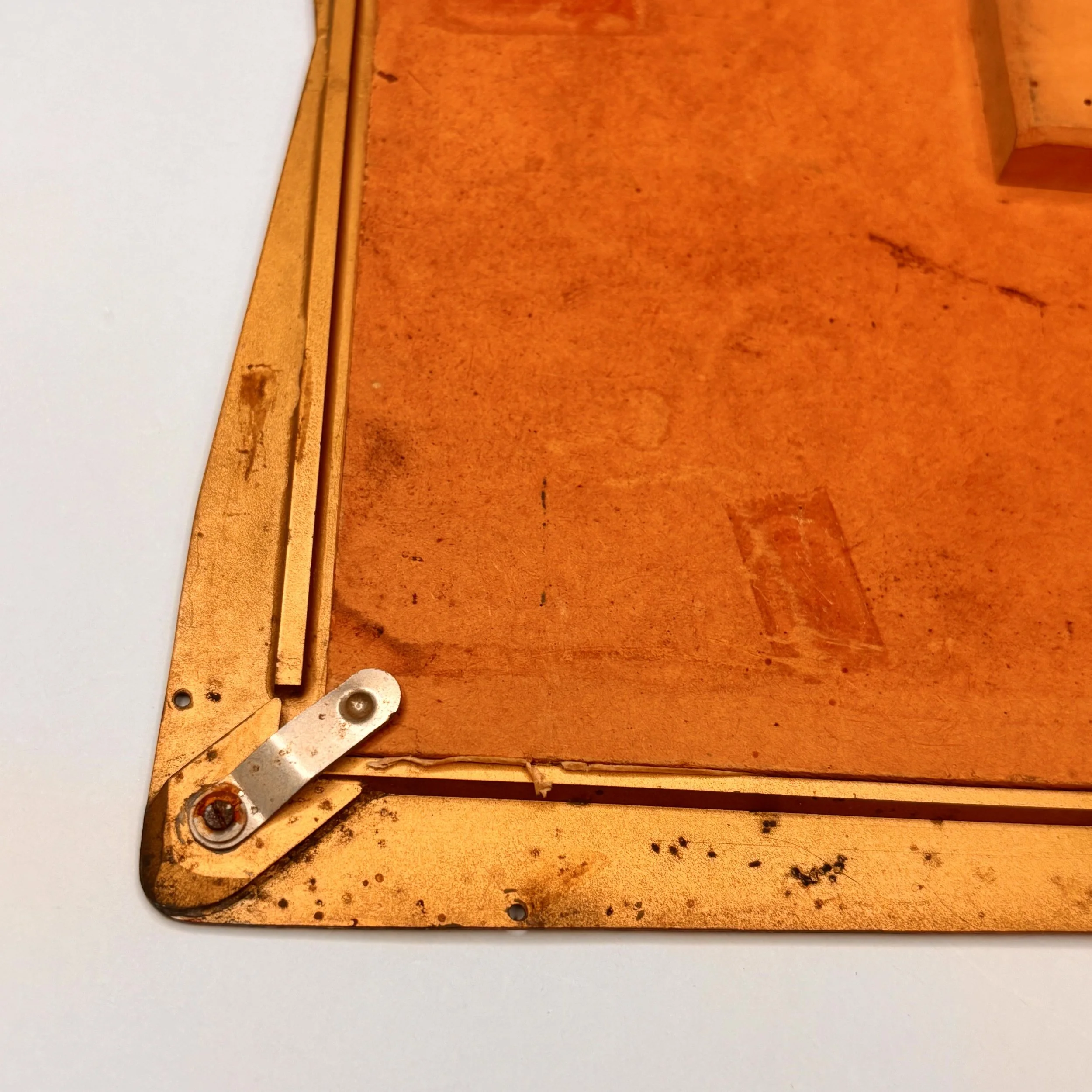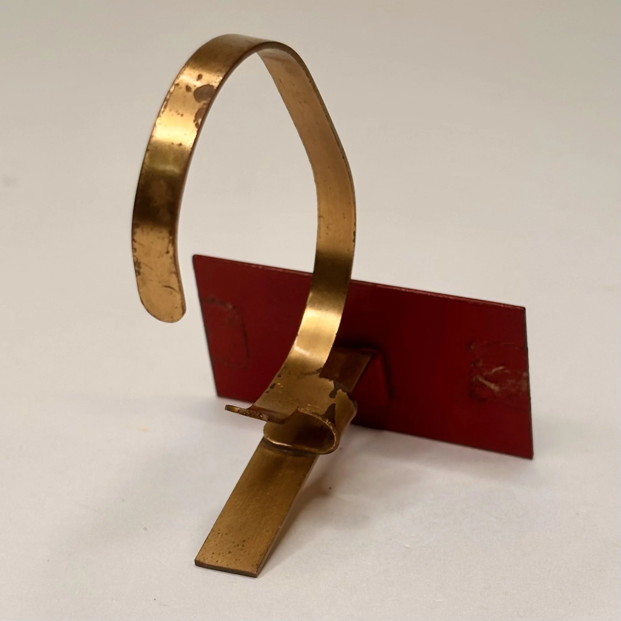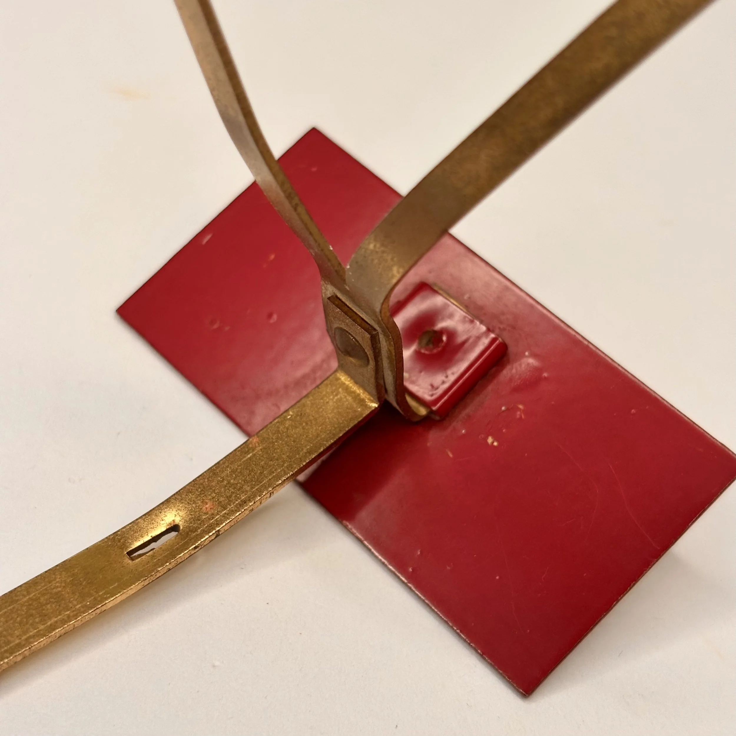 This Omega Golden Era Watch Display Ensemble – 1967 Service List Edition includes a rare Spanish-language service tariff sheet and two original Omega watch display stands. The main sign is framed in red enamel and gold-toned trim, prominently featuring the iconic Omega logo in raised metallic lettering. The printed list details official watch repair rates starting from January 10, 1967, highlighting Omega’s historical pricing for timepieces and parts. Accompanying the signage are two gold-tone metal stands with red Omega logo bases, designed to showcase wristwatches—one with a classic loop form and the other an extended, adjustable height variant, both evoking mid-century retail aesthetics.