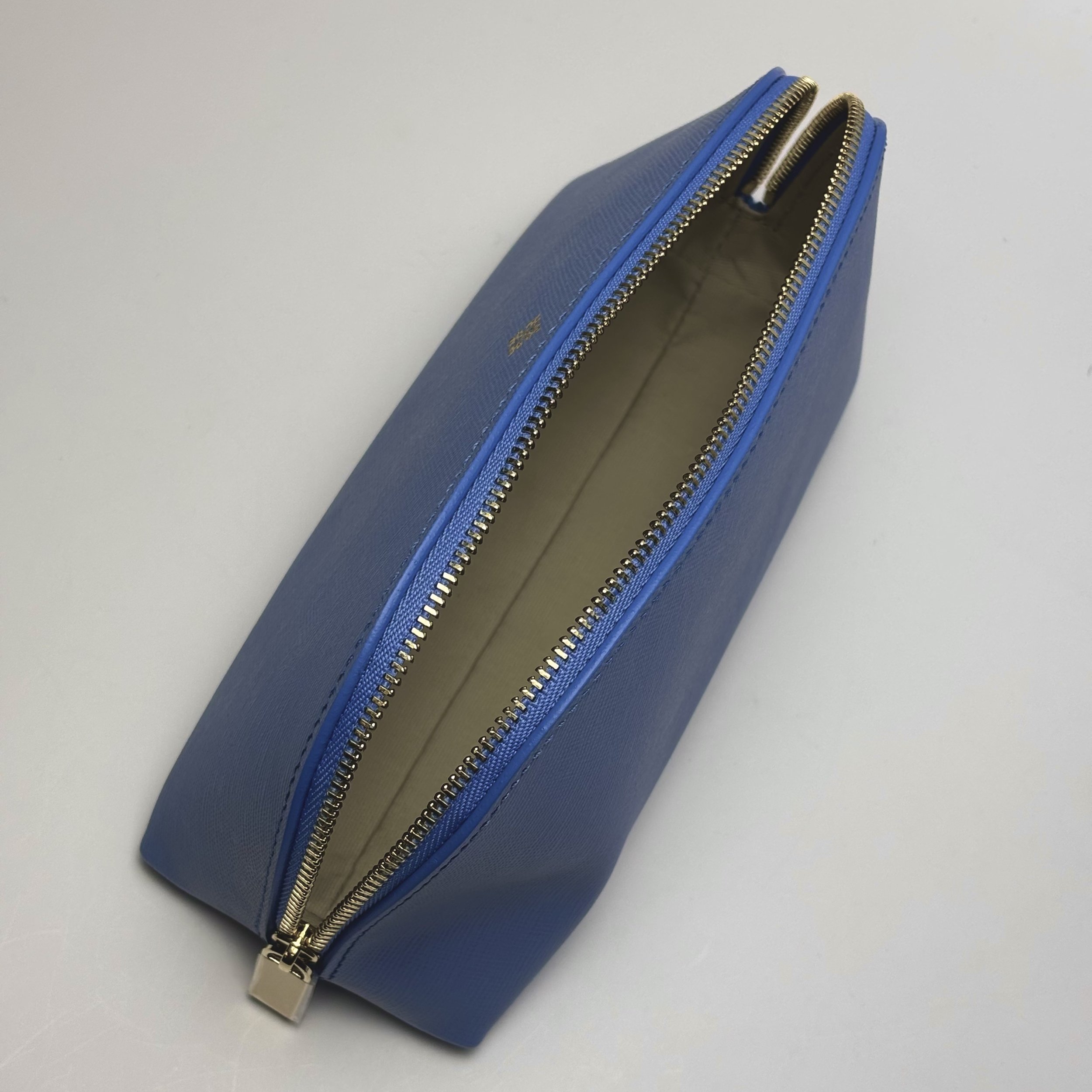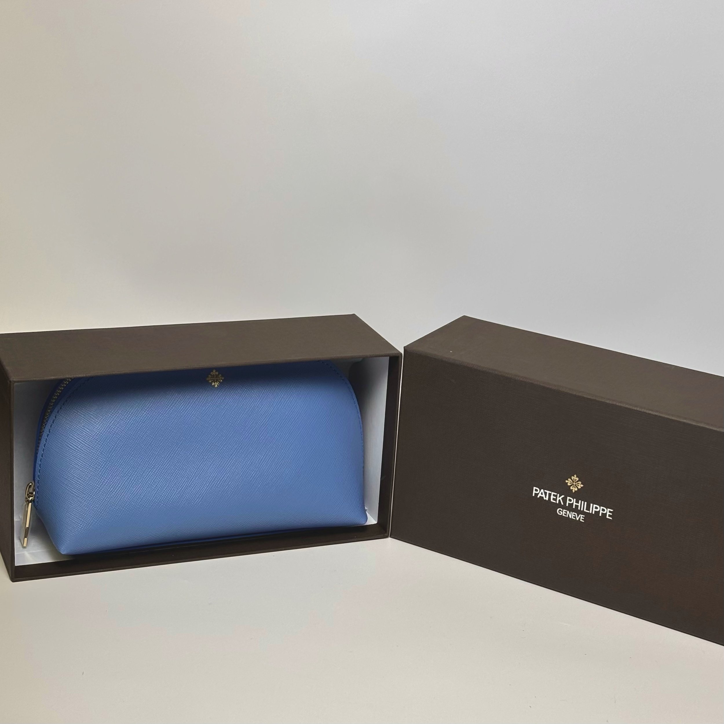 This exquisite Patek Philippe Calatrava Blue Saffiano Travel Pouch in a striking sky-blue hue is crafted from high-quality Saffiano leather, known for its durable crosshatch texture and refined appearance. The minimalist, curved design is accentuated by a gold-tone zipper with a beautifully engraved logo pull, ensuring secure closure while adding a touch of elegance. A subtle gold-embossed Calatrava cross logo adorns the front, symbolizing Patek Philippe’s timeless sophistication. The interior is lined with a soft beige fabric, offering gentle protection for delicate items such as luxury timepieces, jewelry, or accessories. Presented in a sleek original box, this pouch embodies the brand’s legacy of precision and elegance.