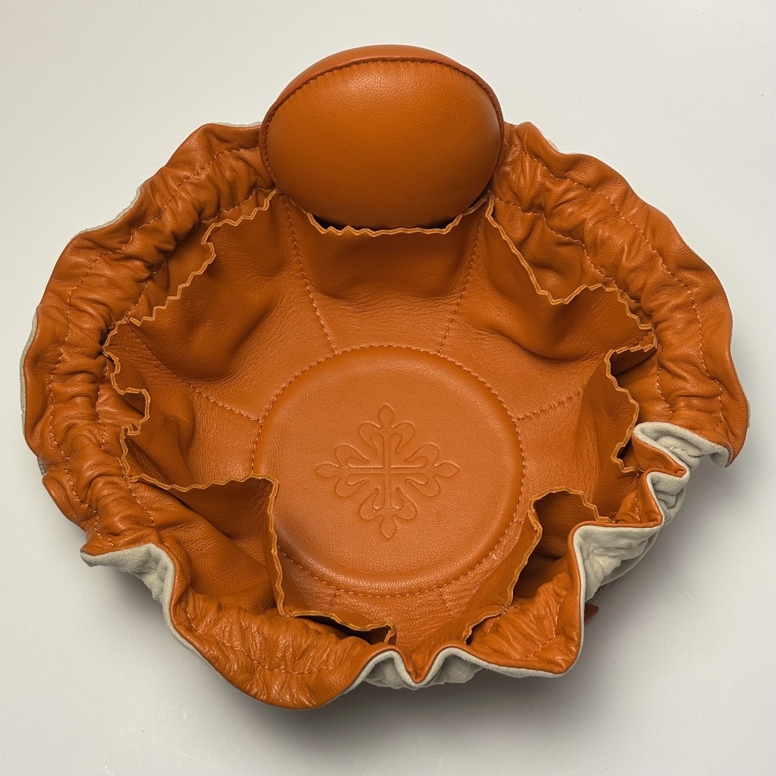 This Patek Philippe Calatrava Drawstring Pouch offers a refined storage solution for your timepiece accessories or personal valuables. Crafted with luxurious beige suede on the exterior and lined with rich orange leather, the pouch boasts an elegant contrast of textures and colors. The orange leather interior is embossed with Patek Philippe’s signature Calatrava cross emblem, exuding sophistication and attention to detail. Dual beige drawstrings finished with leather accents ensure smooth closure while adding a stylish touch. Presented in its original black Patek Philippe Geneva box, this pouch embodies the brand’s legacy of fine craftsmanship and luxury.