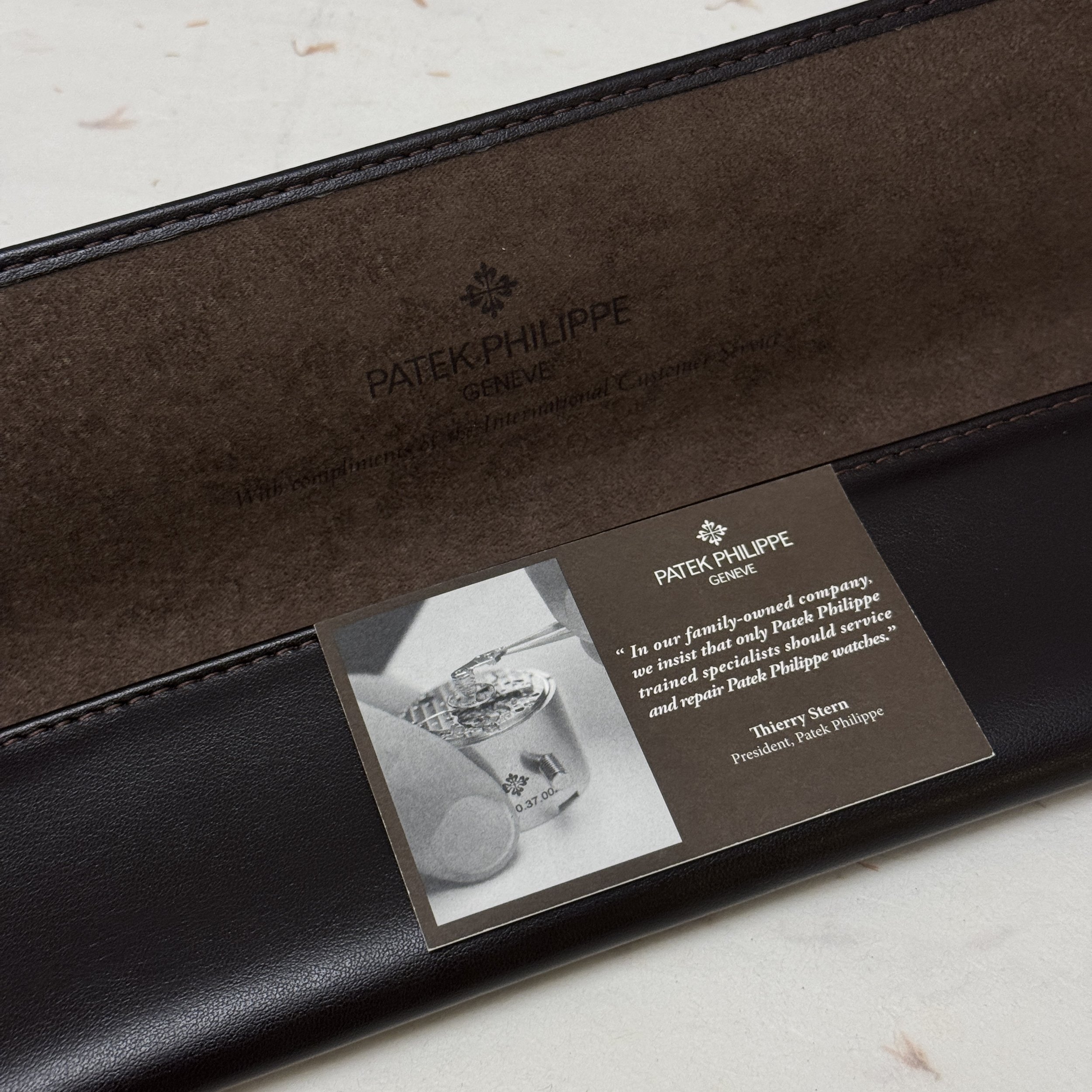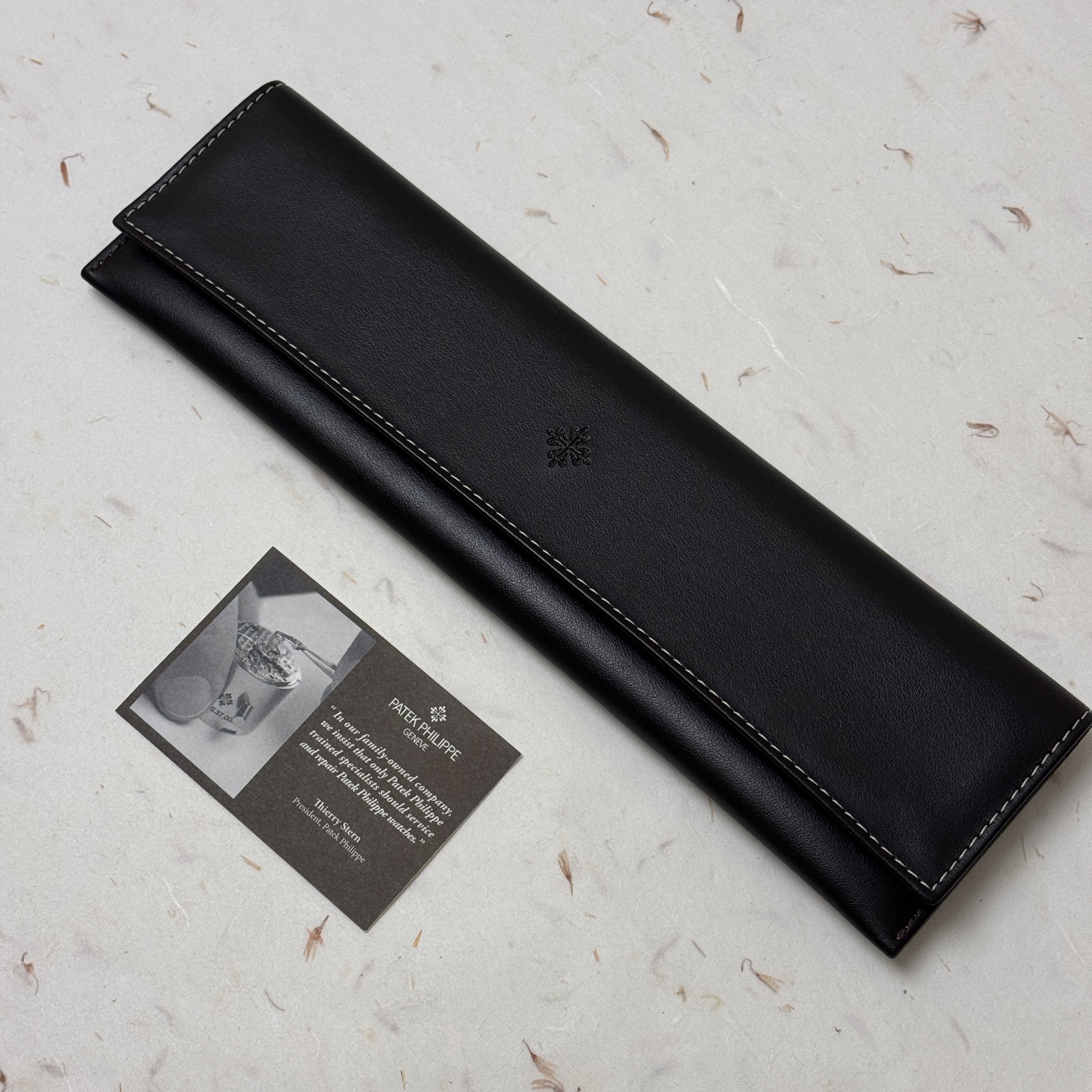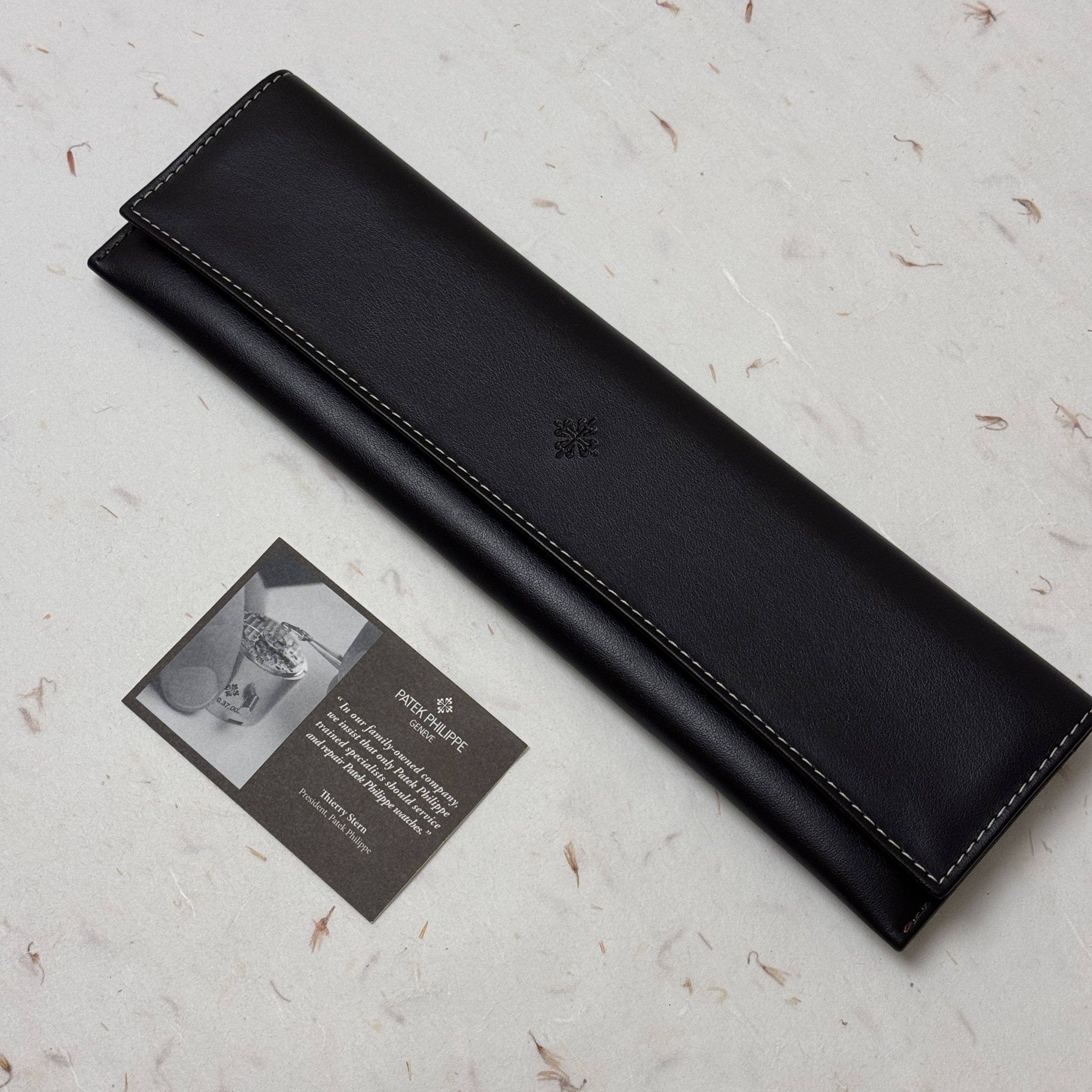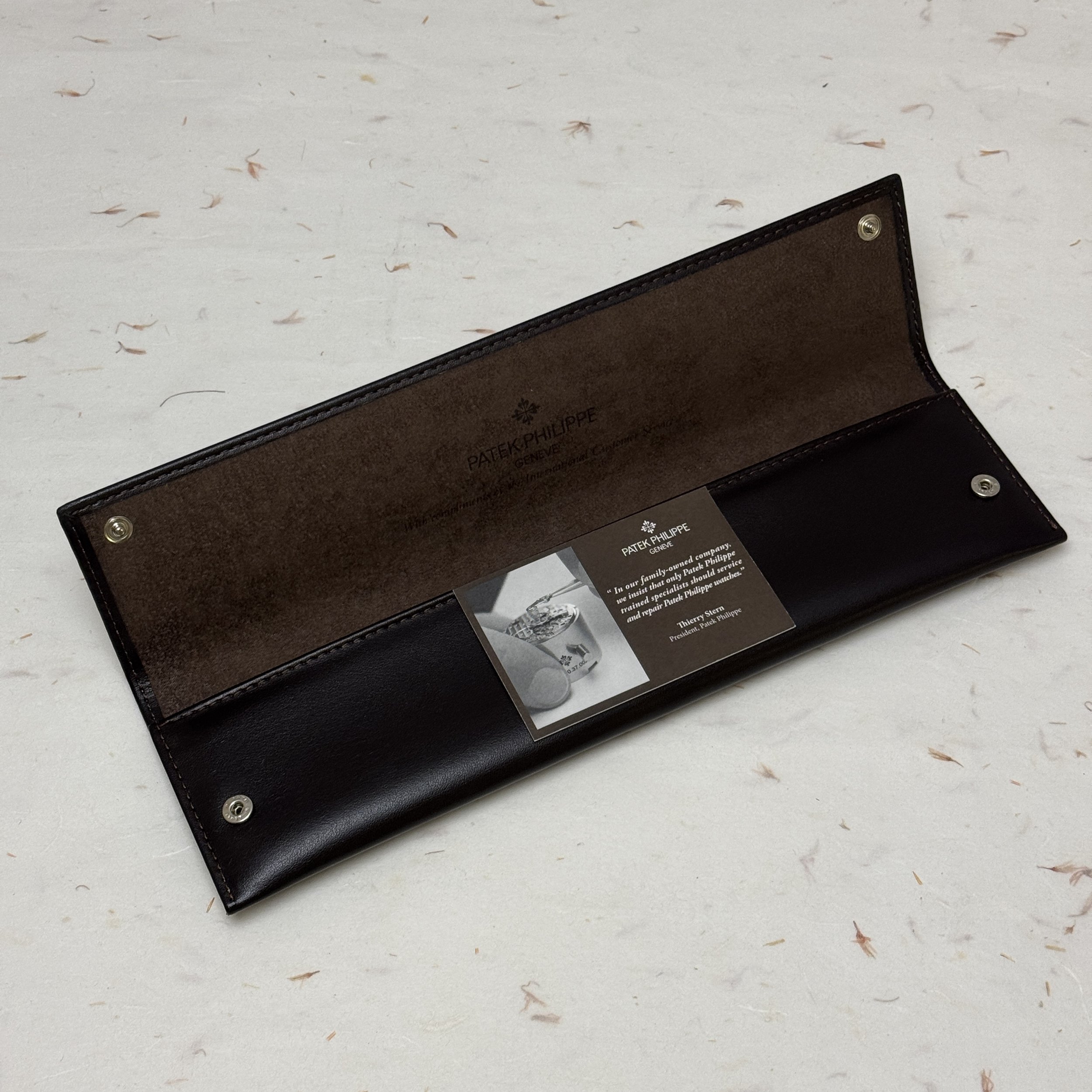 This Patek Philippe Calatrava Slimfold Leather Travel Pouch is a symbol of refined craftsmanship and sophistication. Designed to protect and transport your prized timepiece, the pouch is crafted from high-quality leather with a smooth finish, featuring the iconic Patek Philippe Calatrava cross subtly embossed on the flap. The interior is lined with plush brown suede, ensuring gentle protection for your watch, and includes a dedicated card pocket for authenticity or service documentation. Securely fastened with discreet snap buttons, the pouch embodies timeless elegance and functional design, making it a perfect accessory for watch enthusiasts and collectors.