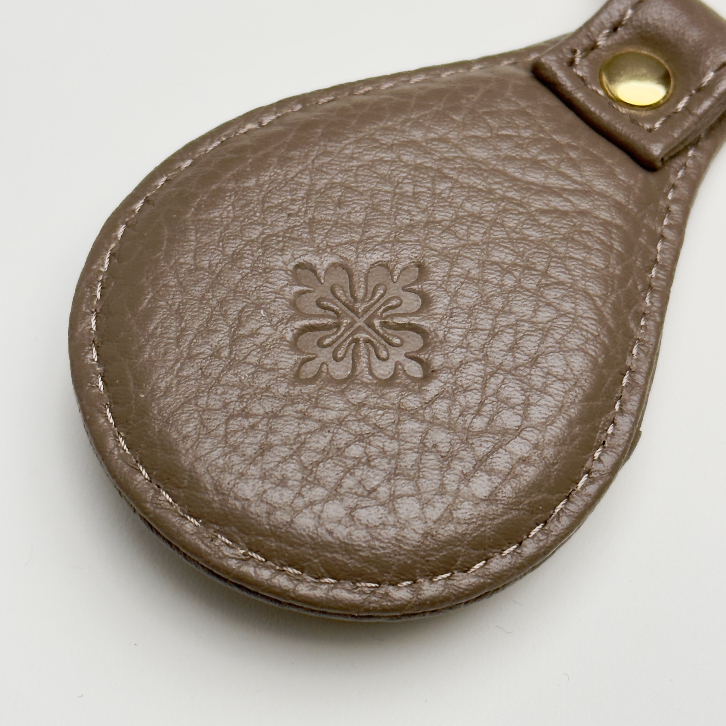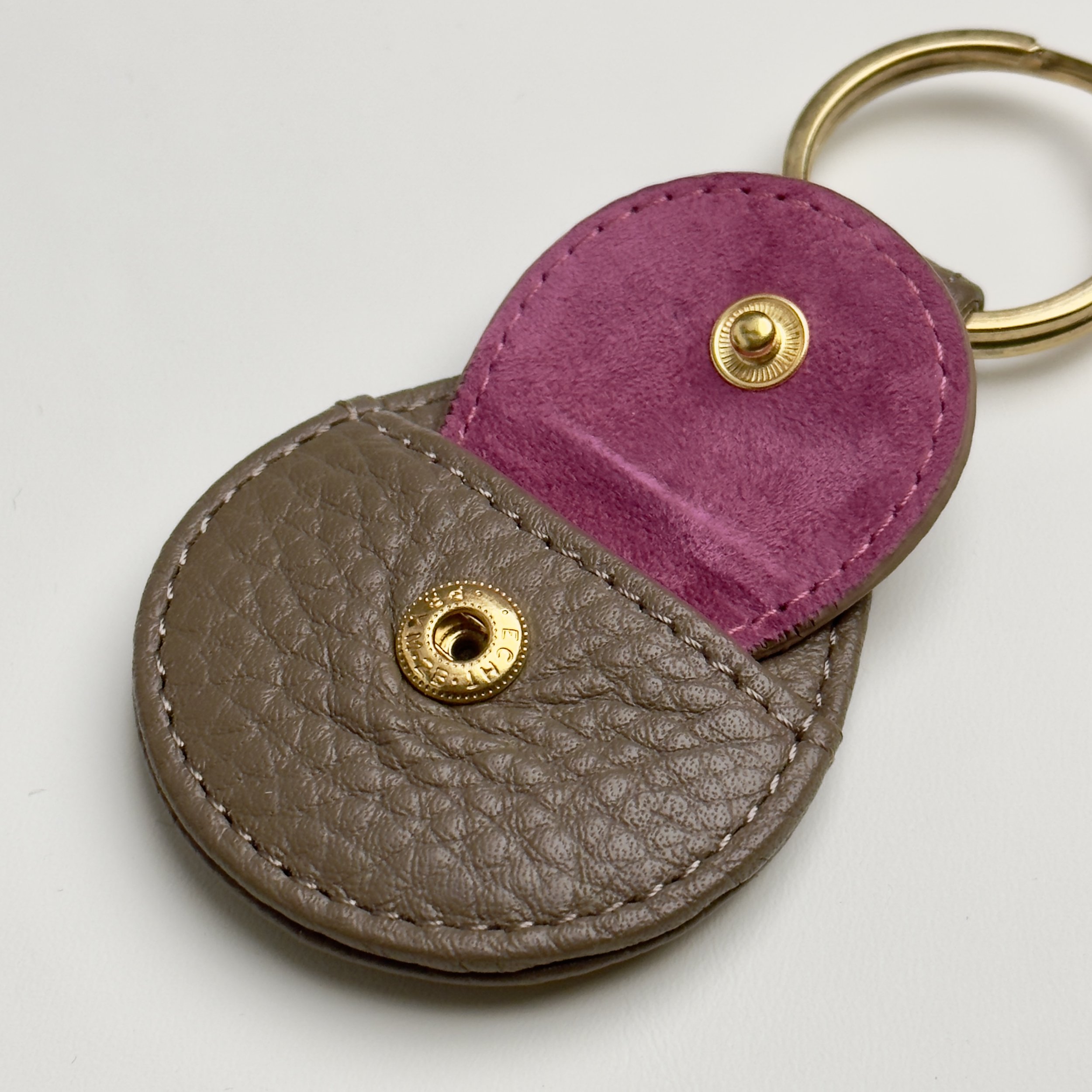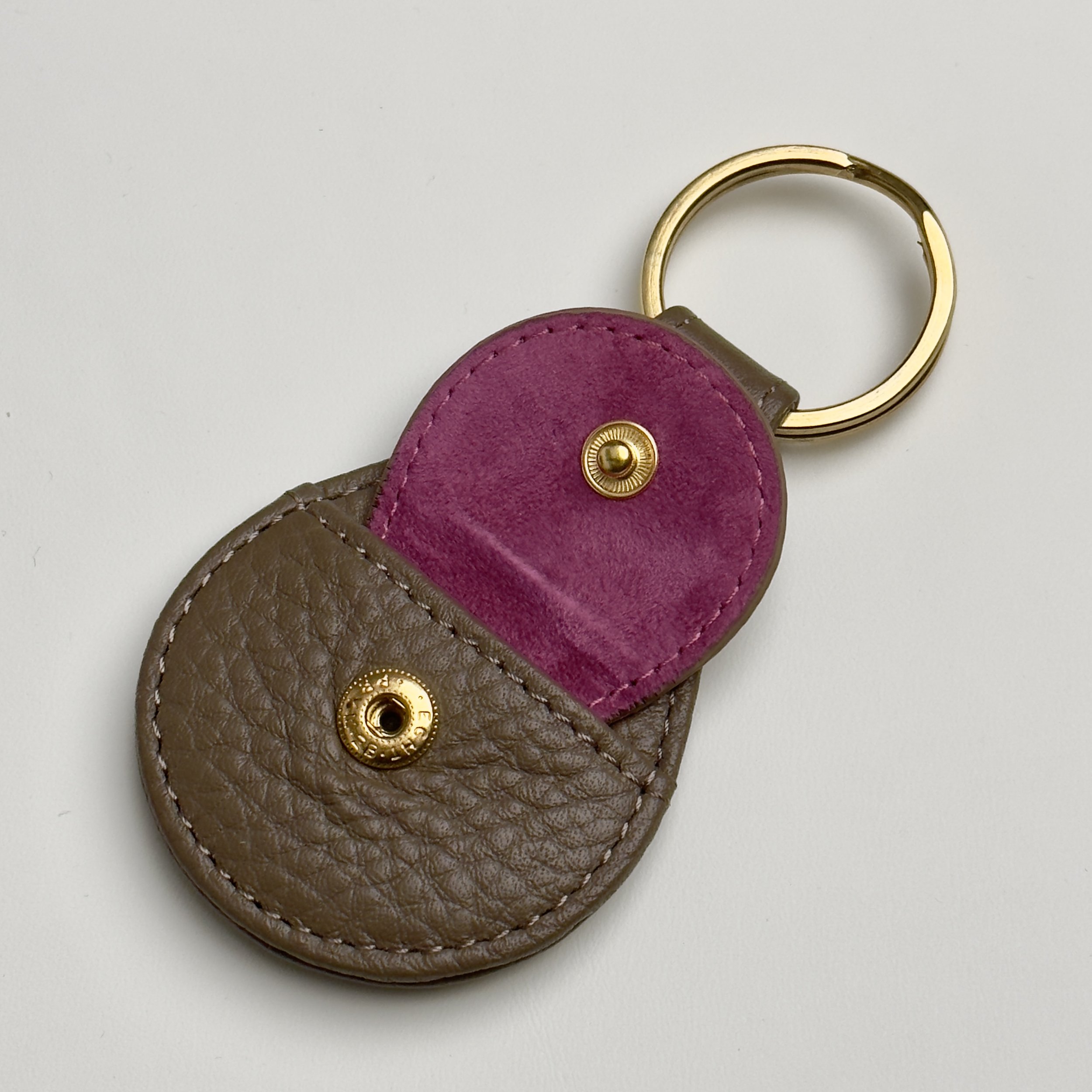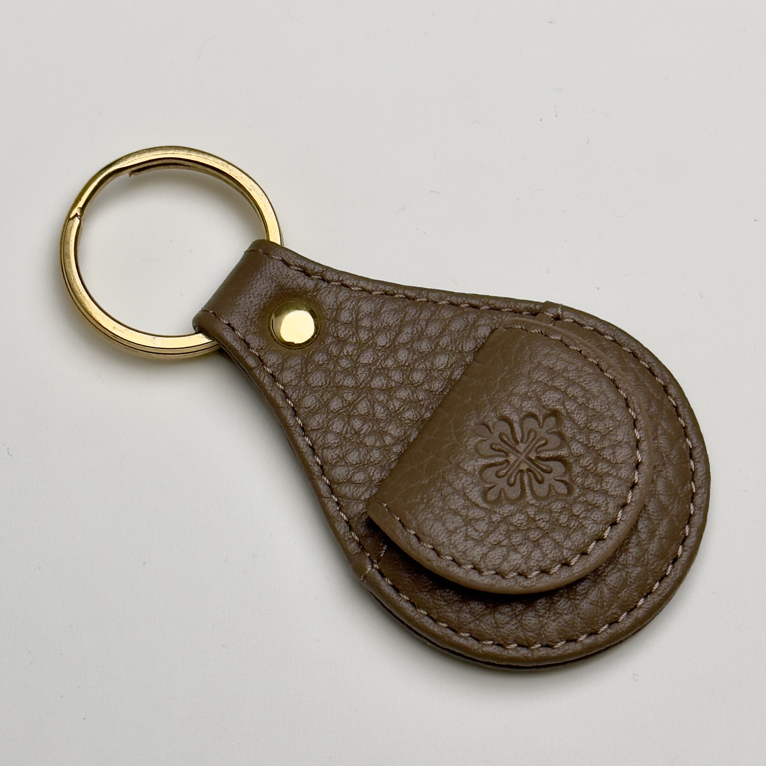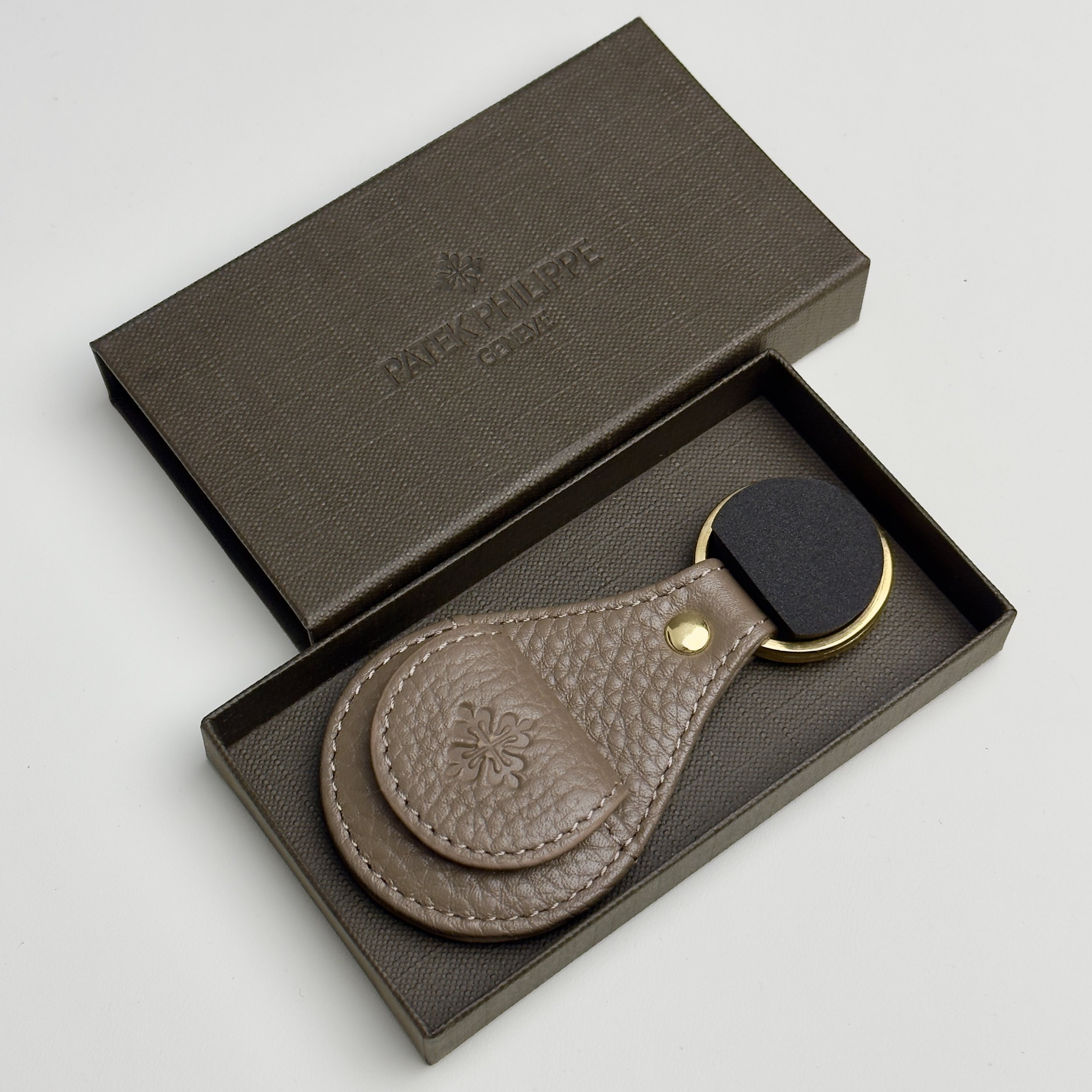 This exquisite Patek Philippe Calatrava Taupe Leather Keychain embodies luxury and functionality. Crafted from premium taupe-colored textured leather, it features meticulous stitching and the iconic Calatrava cross emblem embossed on the front, highlighting the brand’s sophistication. The design incorporates a snap-button pouch lined with plush magenta suede, perfect for small valuables or tokens, and a polished gold-tone keyring that adds an opulent touch. Packaged in an elegant Patek Philippe-branded presentation box, this keychain is an ideal accessory for collectors and connoisseurs of refined craftsmanship.