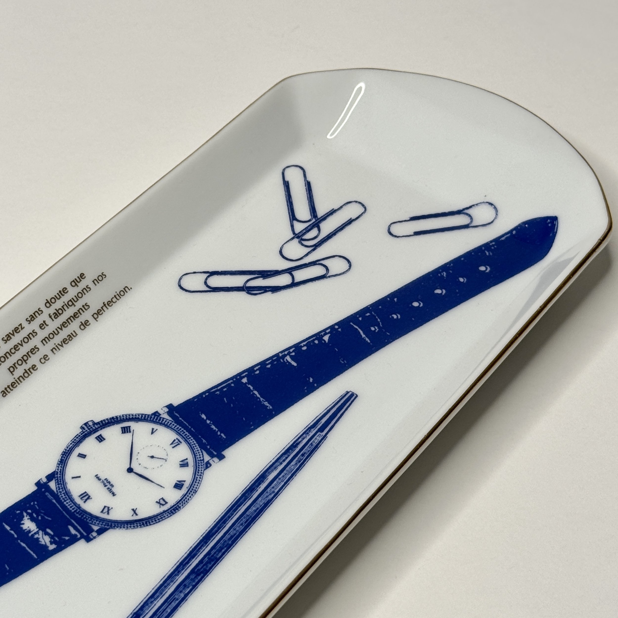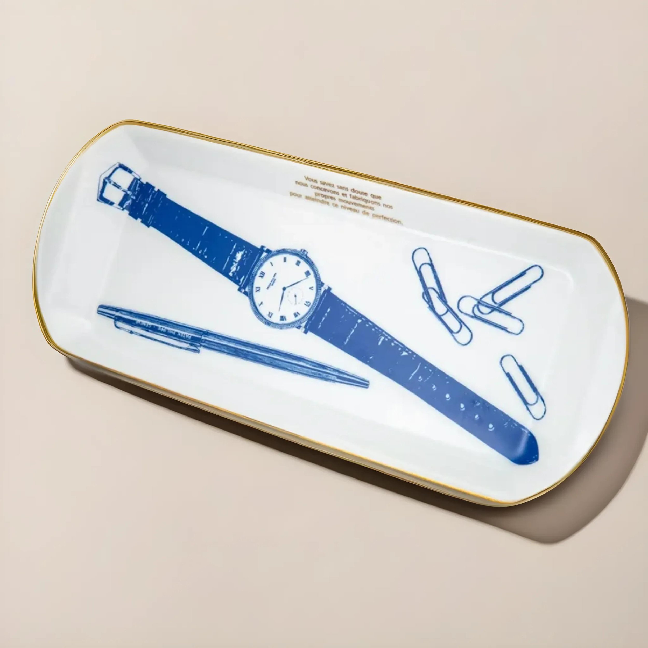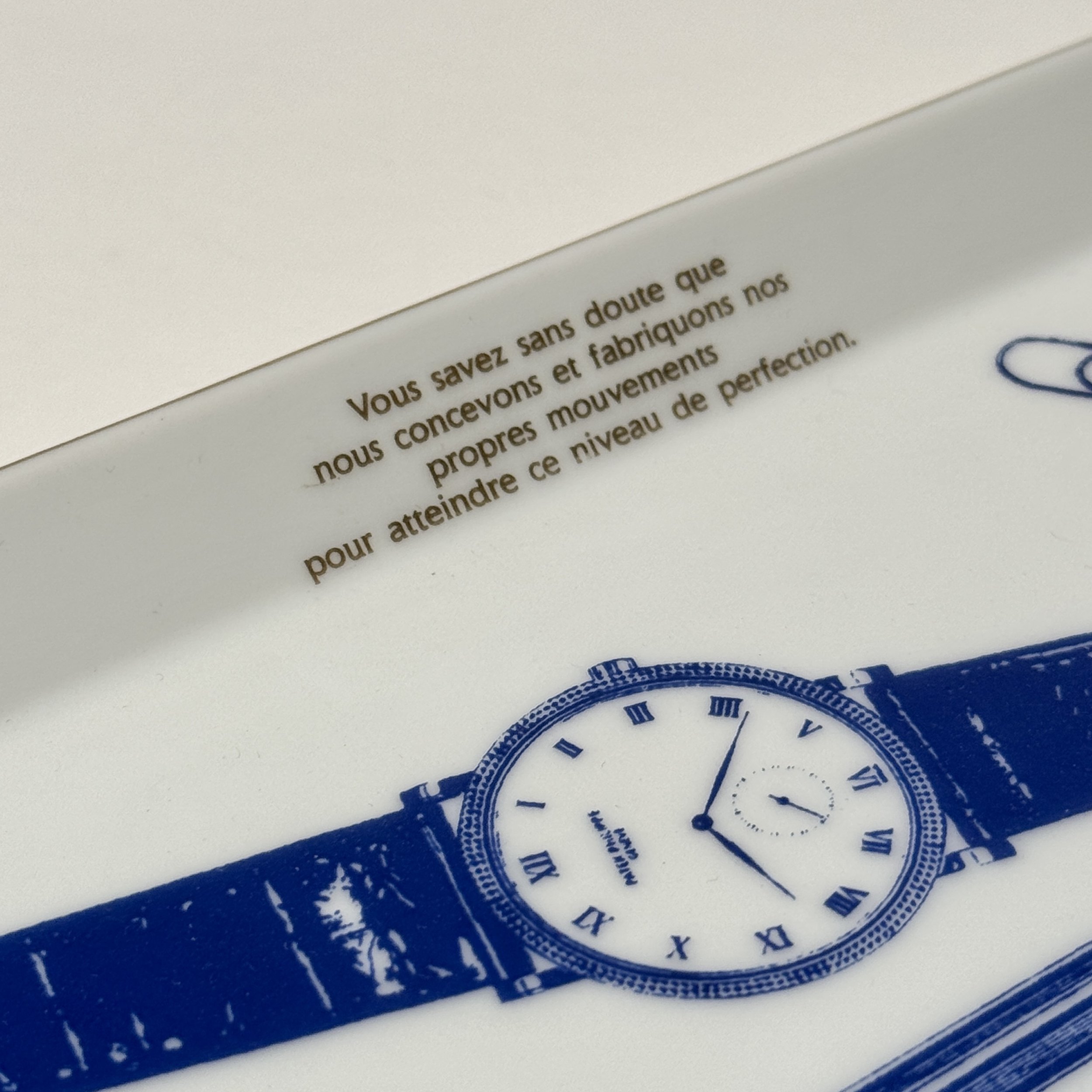 This Patek Philippe Calatrava Wristwatch Porcelain Vide Poche showcases a refined blend of function and elegance, featuring deep blue illustrations of an iconic Calatrava wristwatch, a pen inscribed with “Patek Philippe Genève”, and scattered paperclips, all delicately printed against a lustrous white glazed background. A French inscription above the watch reads: “Vous savez sans doute que nous concevons et fabriquons nos propres mouvements pour atteindre ce niveau de perfection.” (“You undoubtedly know that we design and manufacture our own movements to achieve this level of perfection.”) The tray is bordered by a fine gold trim and finished with the Patek Philippe Genève hallmark on the underside, reinforcing the brand’s enduring craftsmanship and prestige.