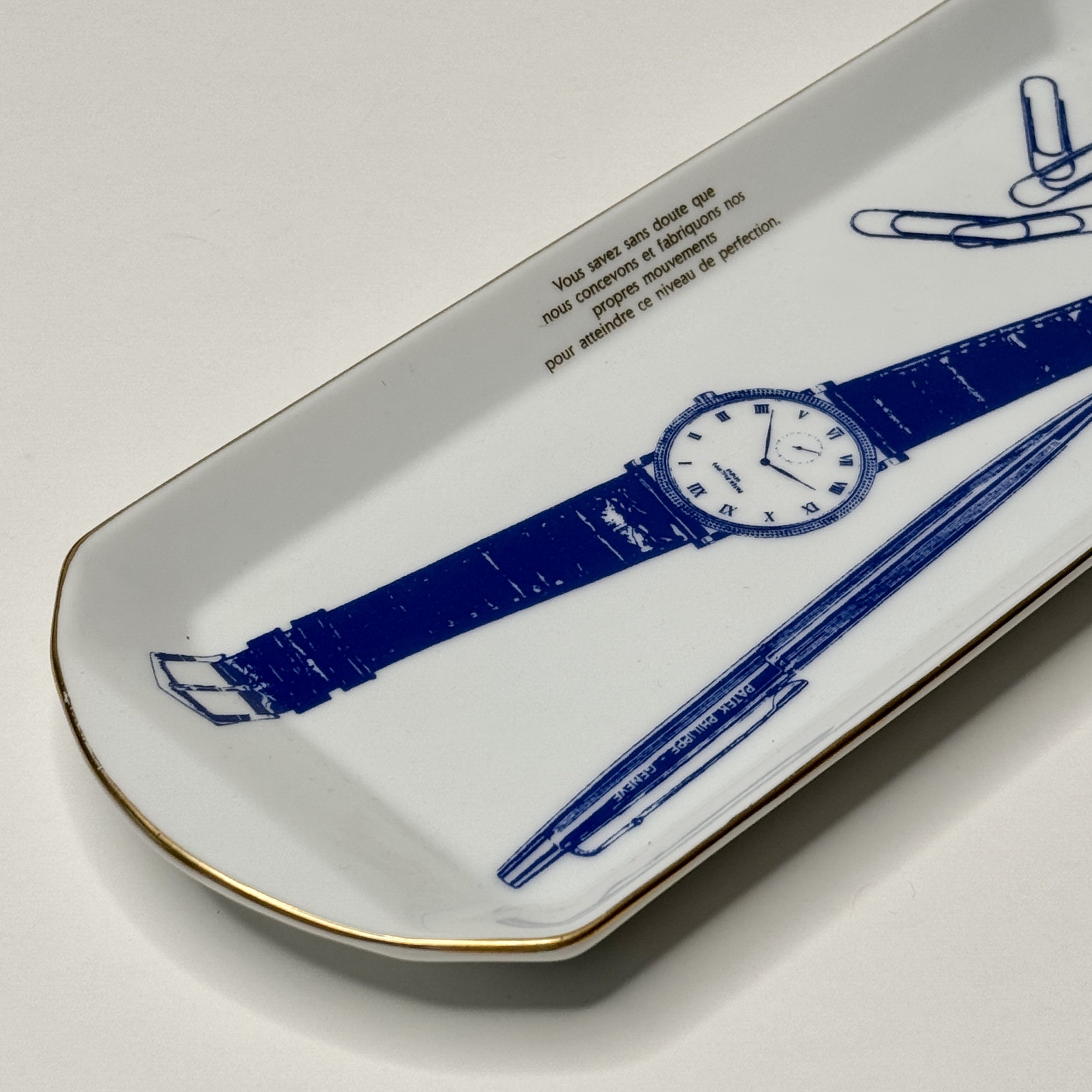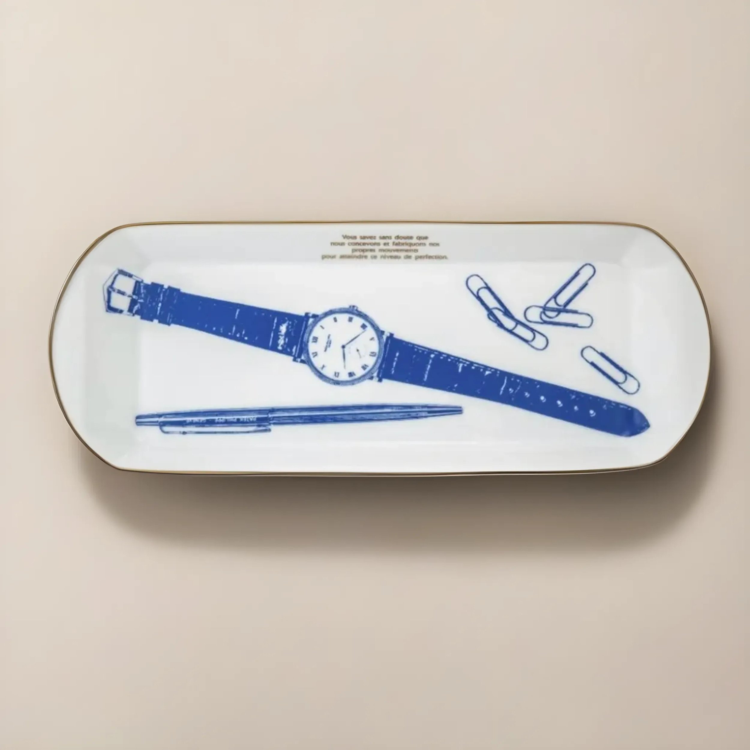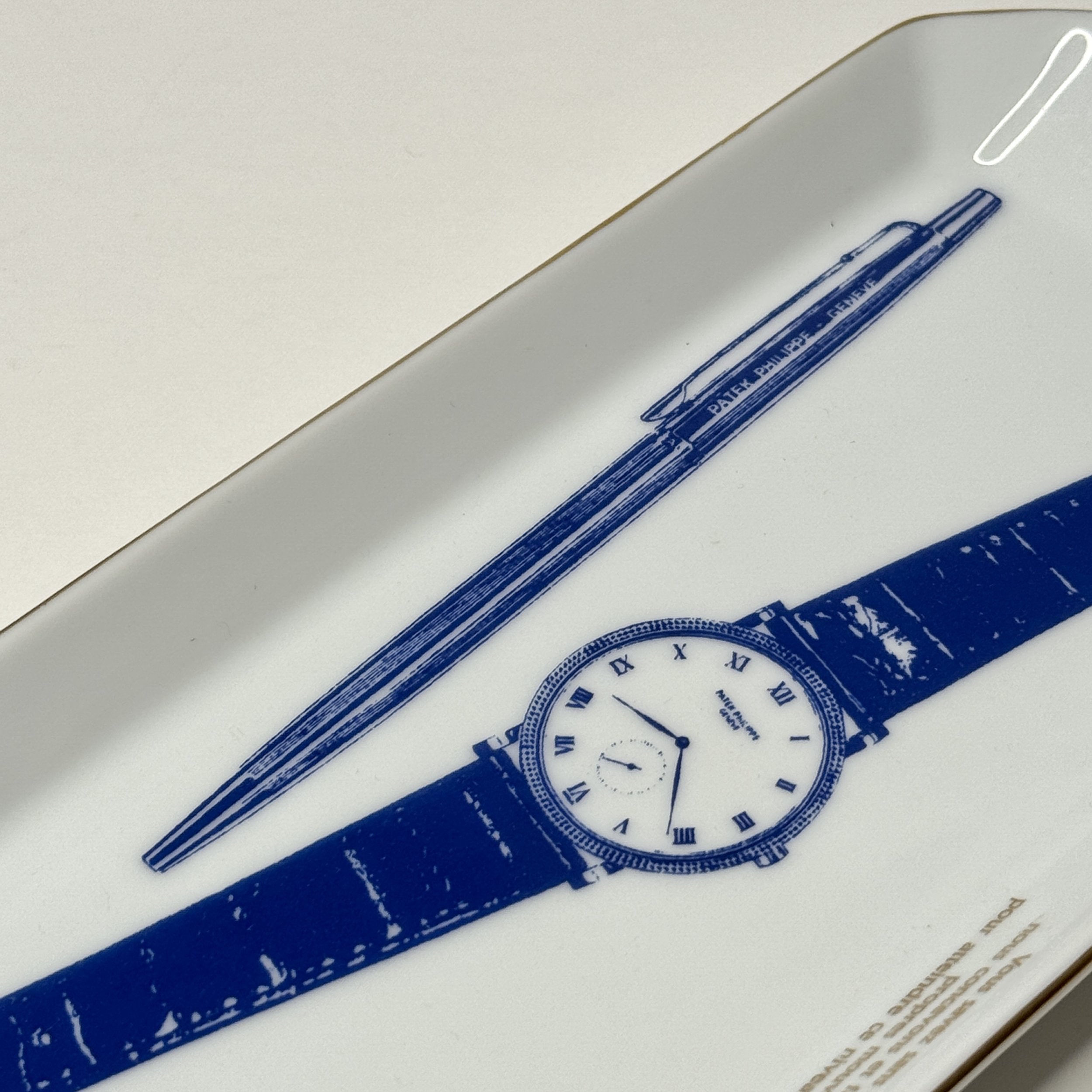 This Patek Philippe Calatrava Wristwatch Porcelain Vide Poche showcases a refined blend of function and elegance, featuring deep blue illustrations of an iconic Calatrava wristwatch, a pen inscribed with “Patek Philippe Genève”, and scattered paperclips, all delicately printed against a lustrous white glazed background. A French inscription above the watch reads: “Vous savez sans doute que nous concevons et fabriquons nos propres mouvements pour atteindre ce niveau de perfection.” (“You undoubtedly know that we design and manufacture our own movements to achieve this level of perfection.”) The tray is bordered by a fine gold trim and finished with the Patek Philippe Genève hallmark on the underside, reinforcing the brand’s enduring craftsmanship and prestige.