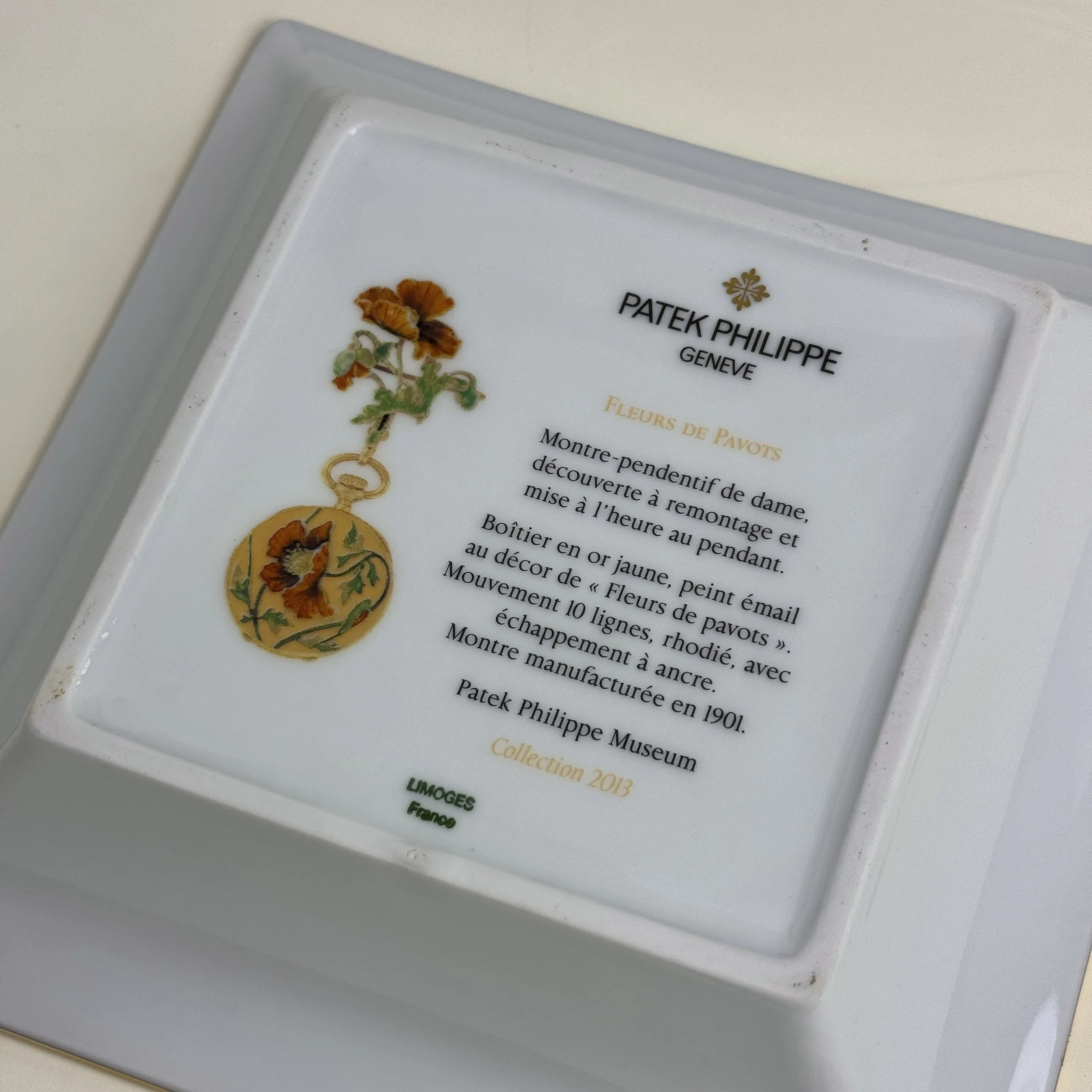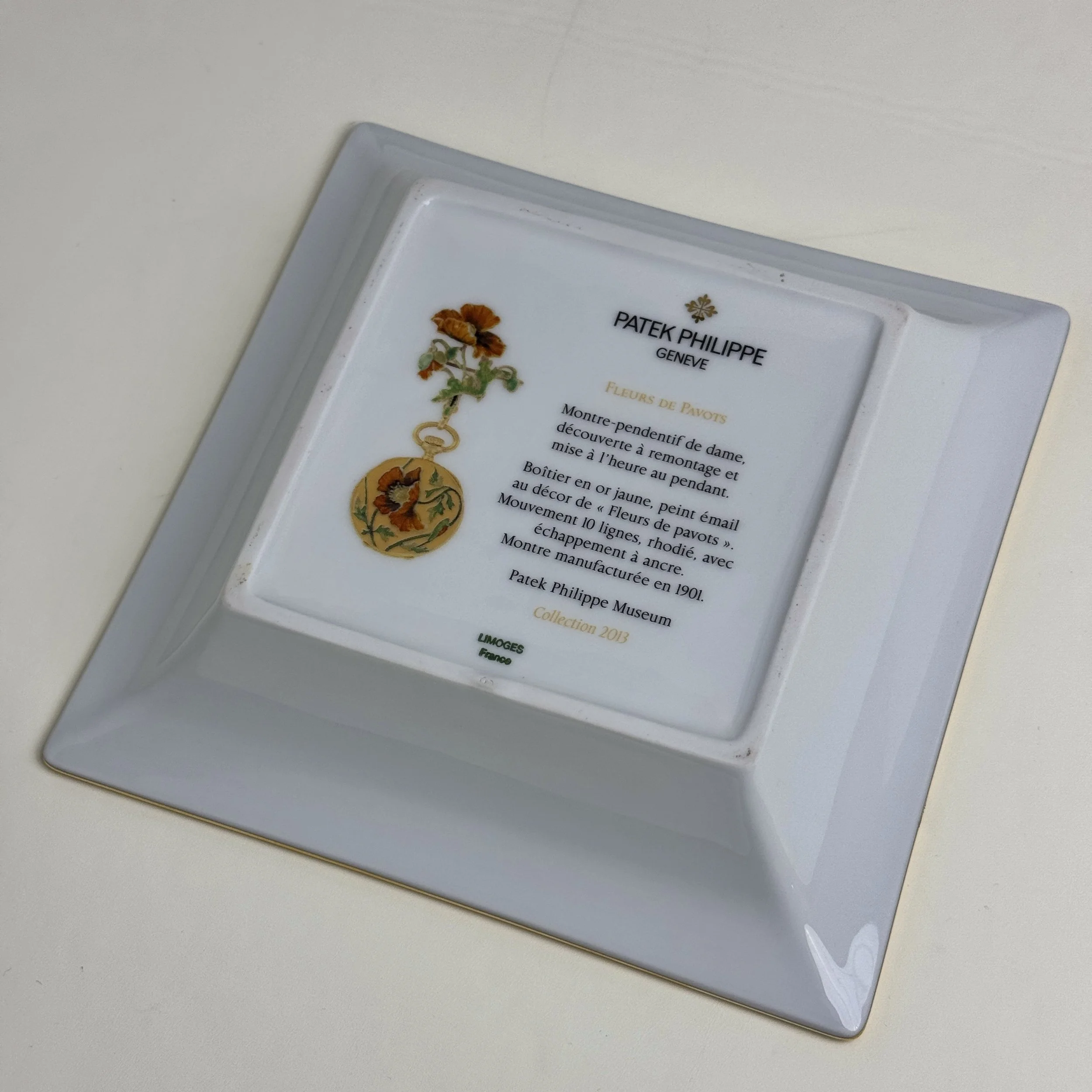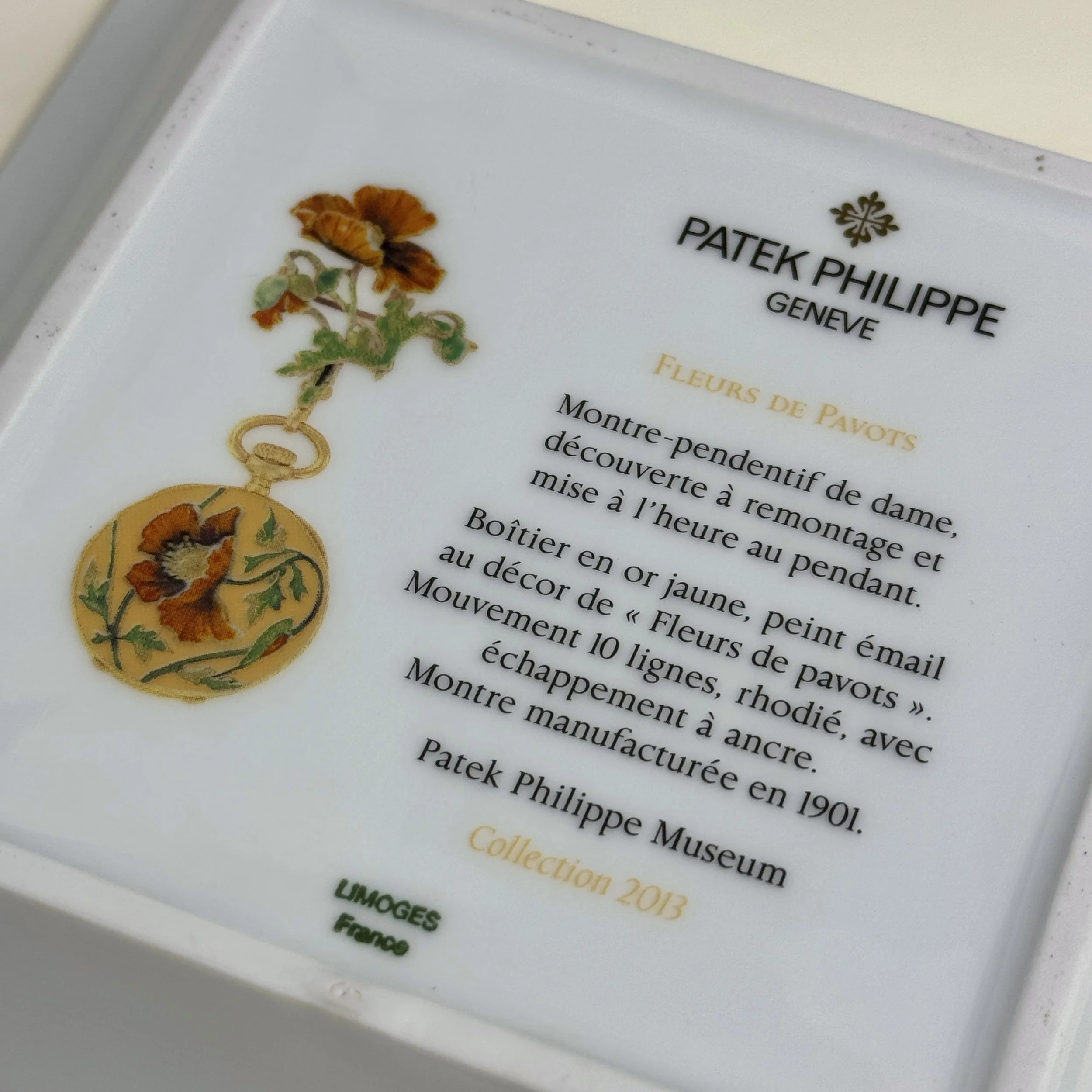 Crafted in Limoges, France, this tray exemplifies the renowned porcelain craftsmanship of the region, produced in collaboration with Patek Philippe to commemorate a historic pocket watch from 1901. The underside features an illustration and text detailing the inspiration behind the design, further solidifying its historical and artistic value.