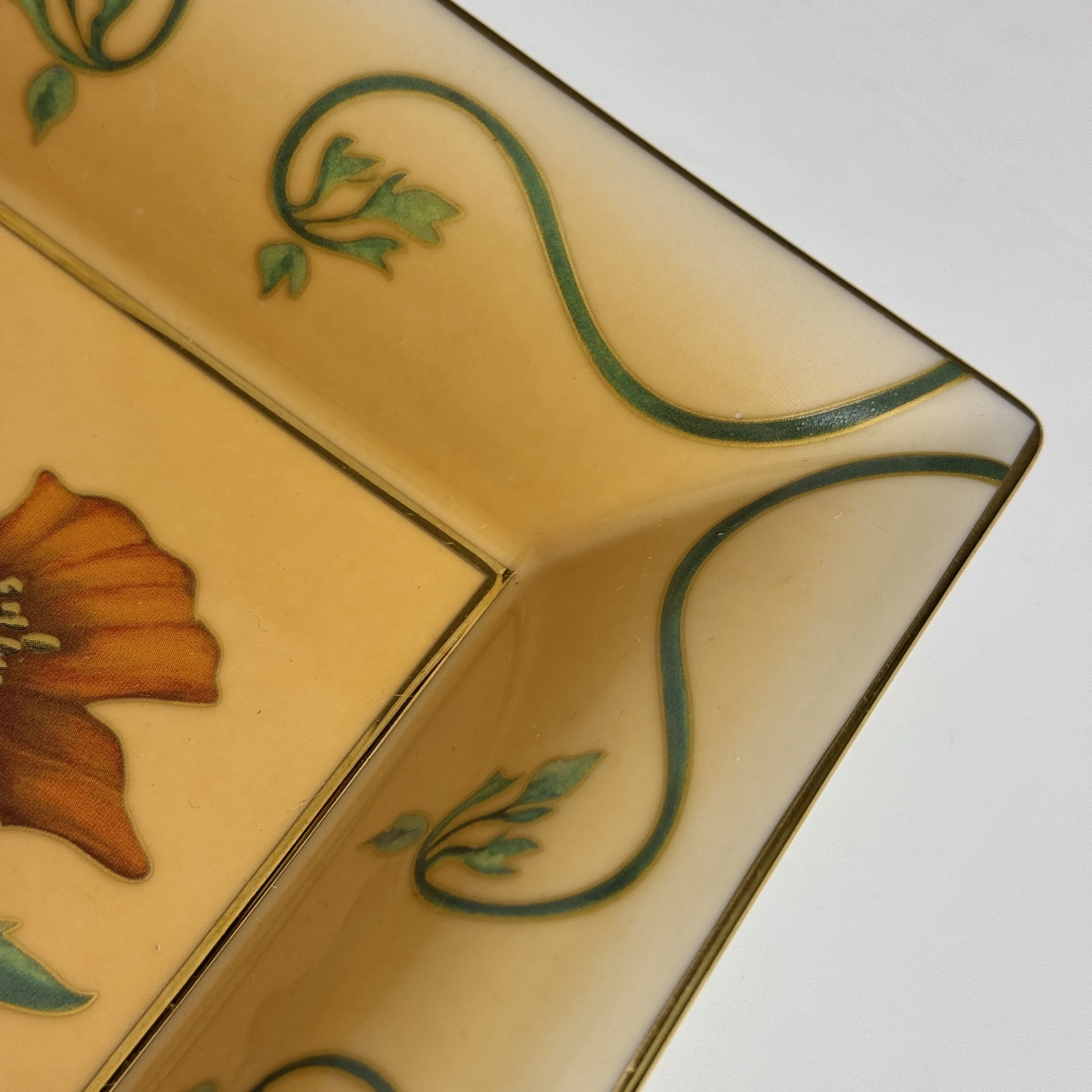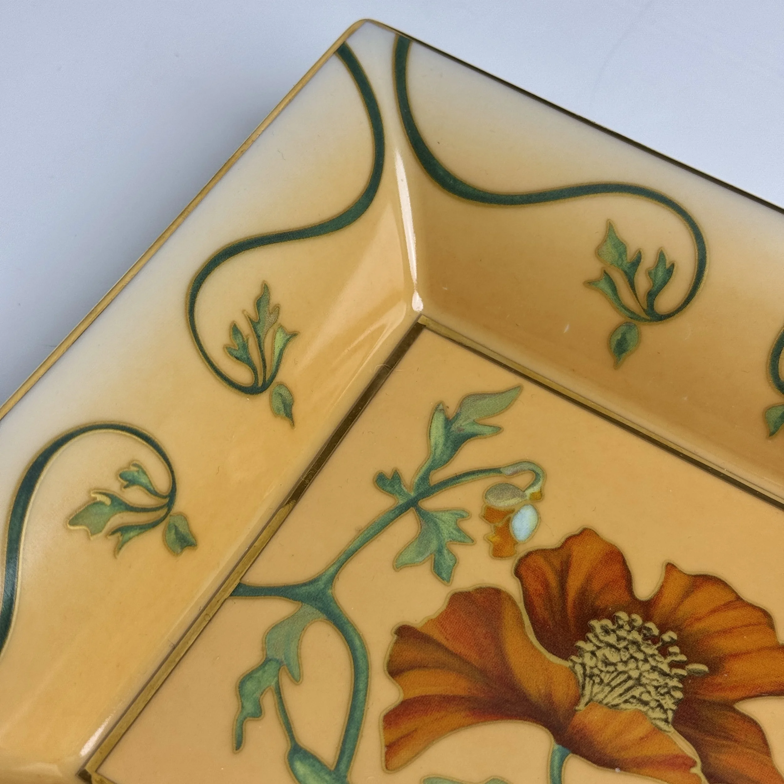 This exquisite Patek Philippe Limoges porcelain tray from the 2013 collection showcases a refined Art Nouveau design featuring vibrant poppy flowers. The warm golden-yellow background is complemented by flowing green vine patterns and a richly detailed red-orange poppy at its center, evoking the elegance of early 20th-century enamel artistry. The delicate gold trim adds a touch of luxury, making it an ideal decorative or functional piece for collectors and connoisseurs of fine porcelain.