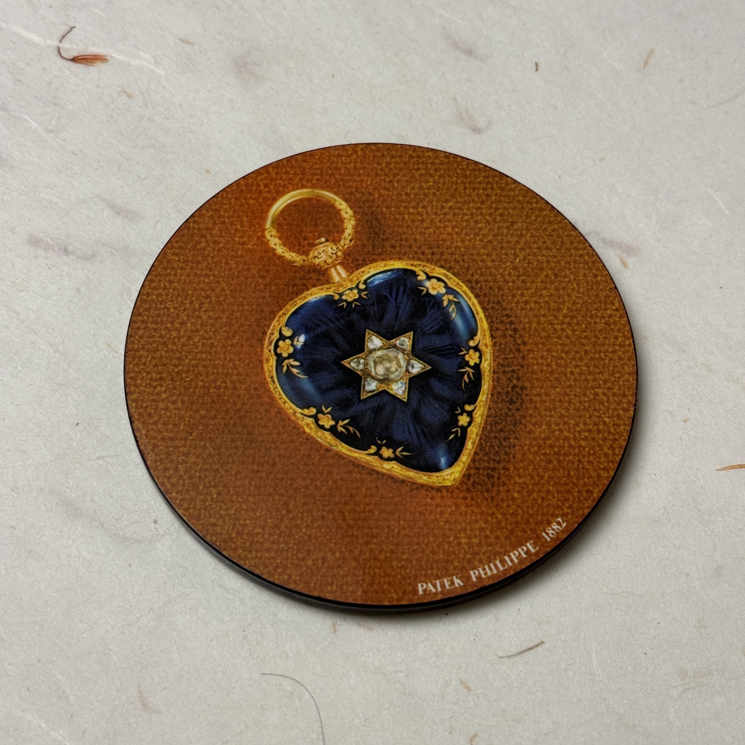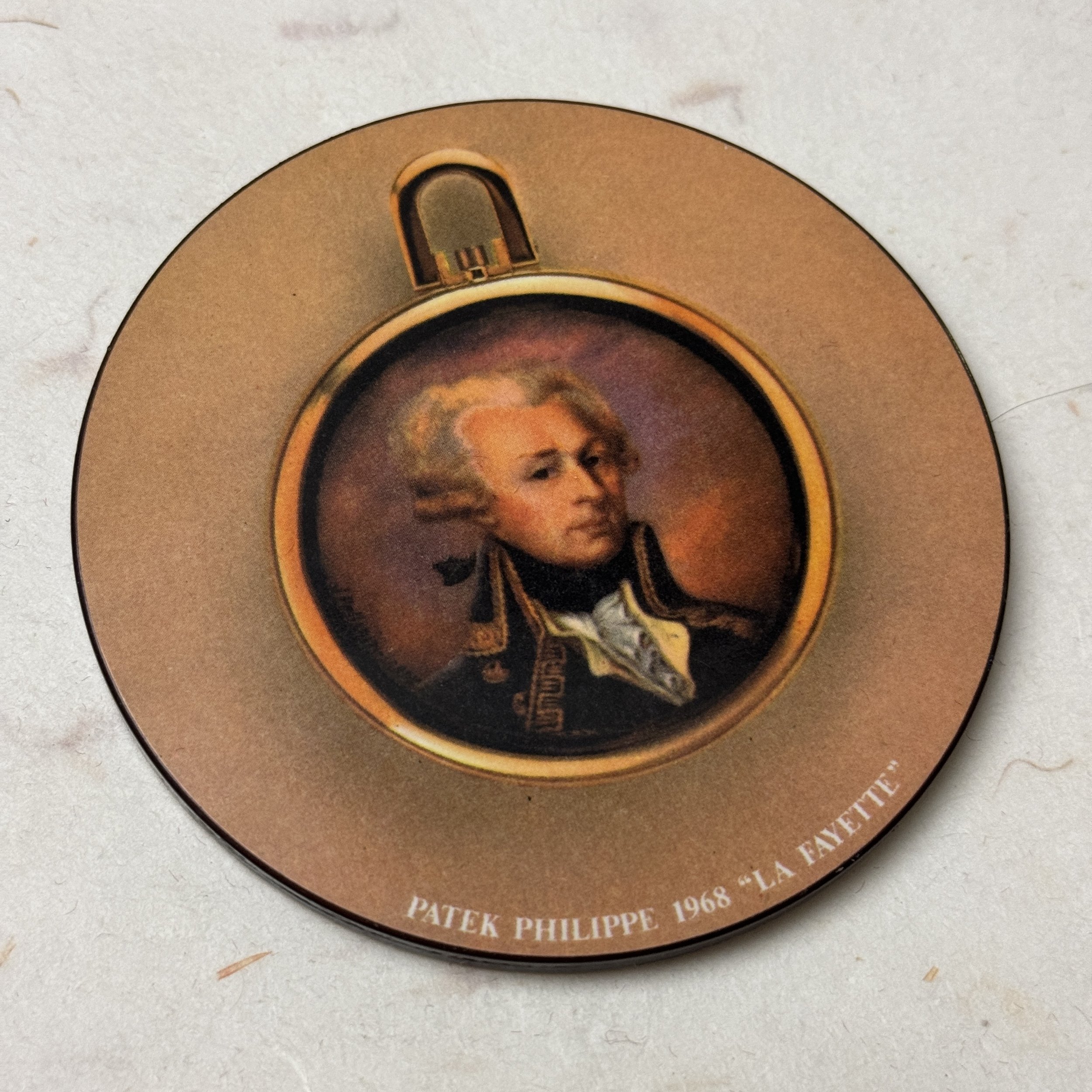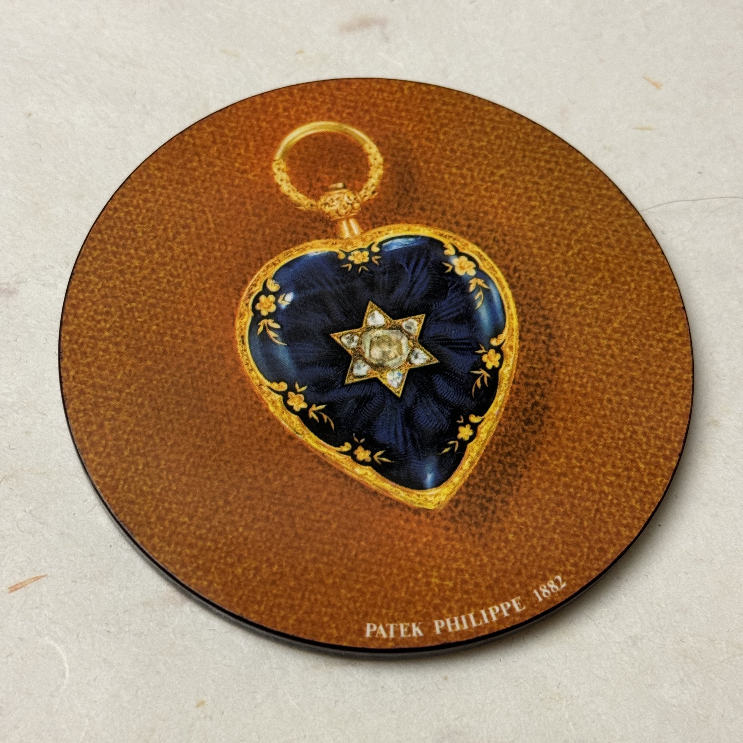 A fine set of 6 wooden coasters each displaying an enamel pocket watch: 1844 designed for maria ii of Braganza; 1882 designed for marie-christine of bourbon; 1894 watch in 18k with floral motive; 1917 designed for count franz hoetzendorf; 1968 enamel depicting marquis de la Fayette; 1970 departure of the mayflower