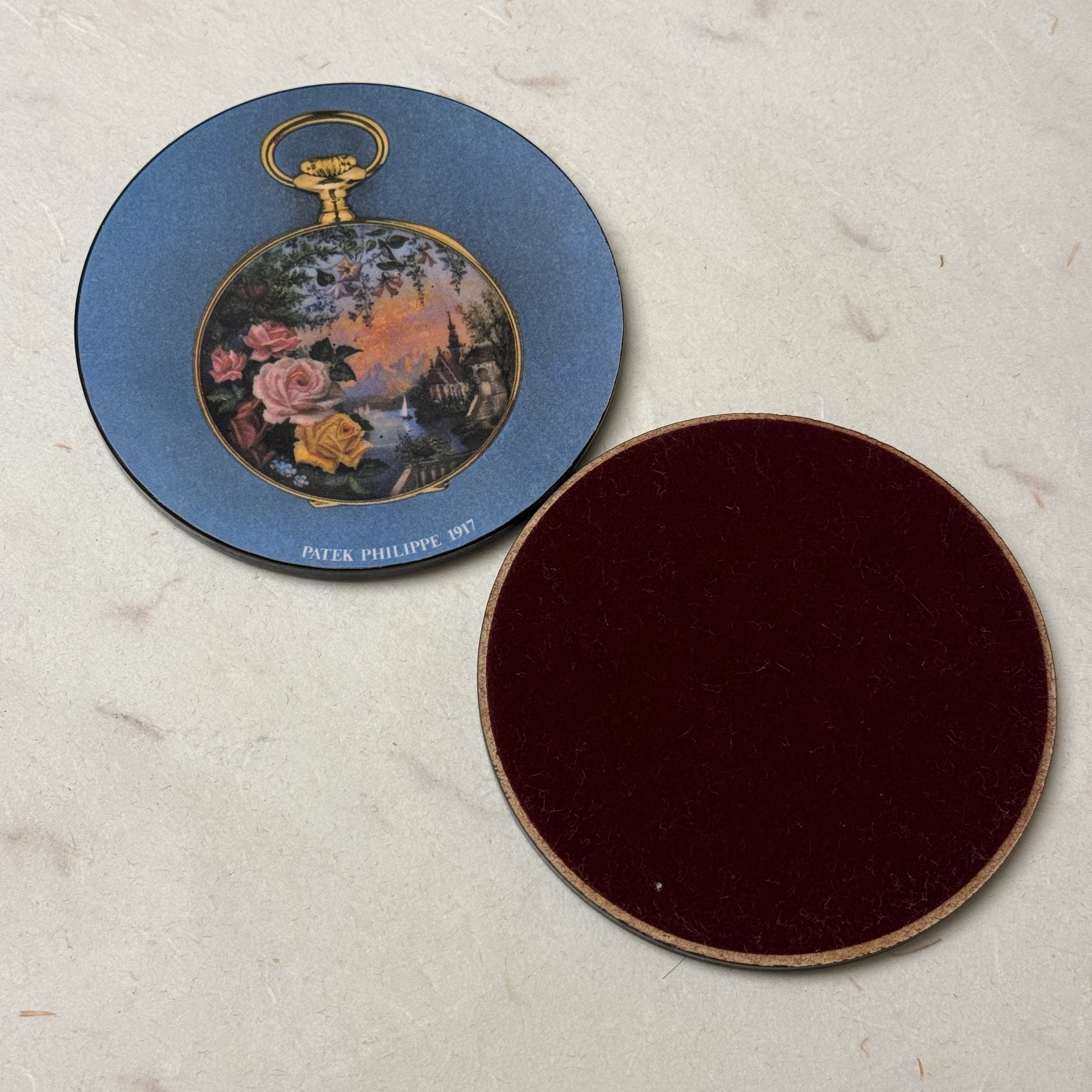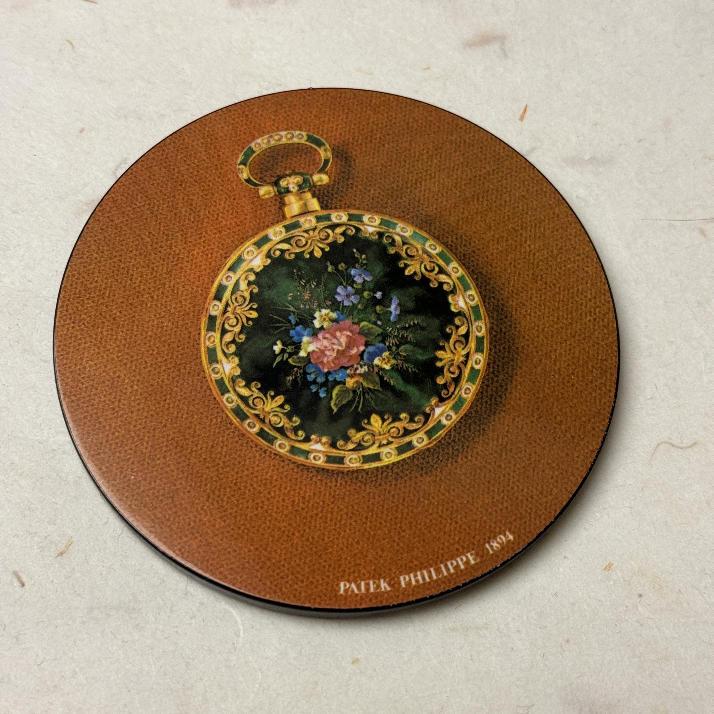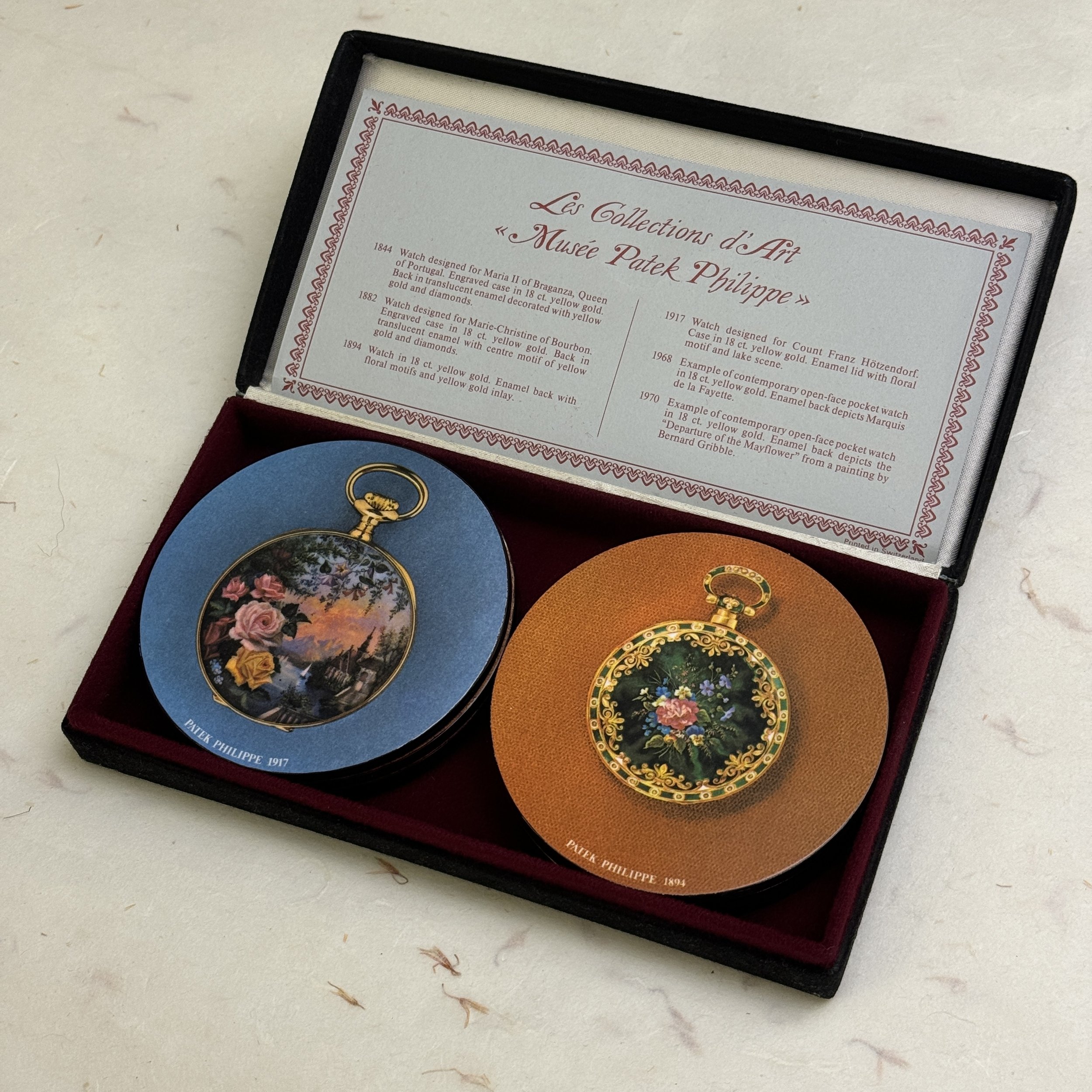 This extremely rare set of six vintage coasters from the Art Collection of the Musée Patek Philippe, in collaboration with Whirlpool, features Extremely Rare (6) Musee Patek Philippe Les Collection d’Art Drink Coasters 1977 and is a true treasure for collectors and enthusiasts. Each coaster is crafted from wood and features intricate designs inspired by historic Patek Philippe pocket watches, reflecting the brand’s dedication to horological artistry. The coasters are preserved in their original fitted box, which also includes a note card detailing the rich history behind each design. The warm tones and detailed imagery on these coasters make them a sophisticated piece of art and a functional accessory. This set is a perfect gift for watch lovers and brand enthusiasts.