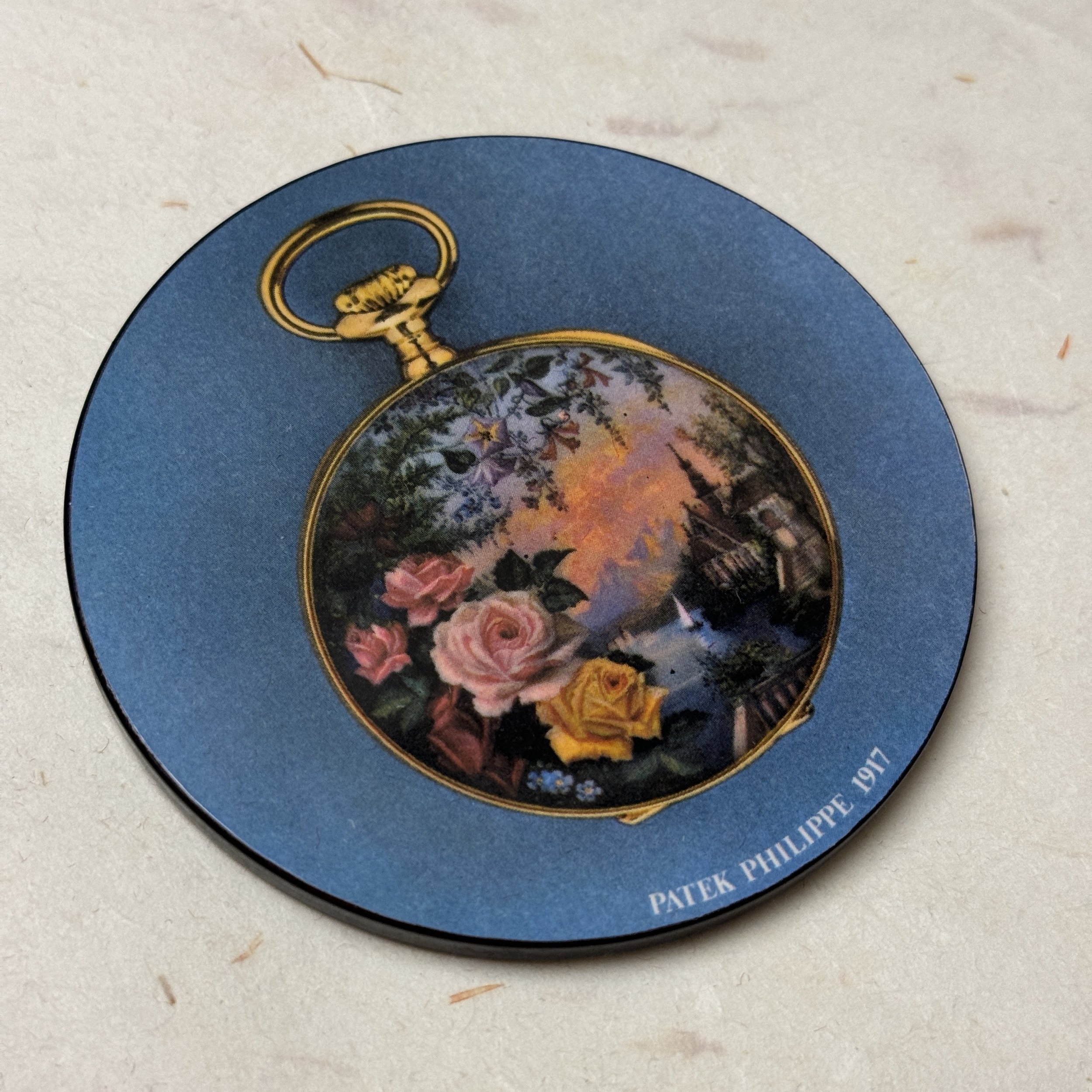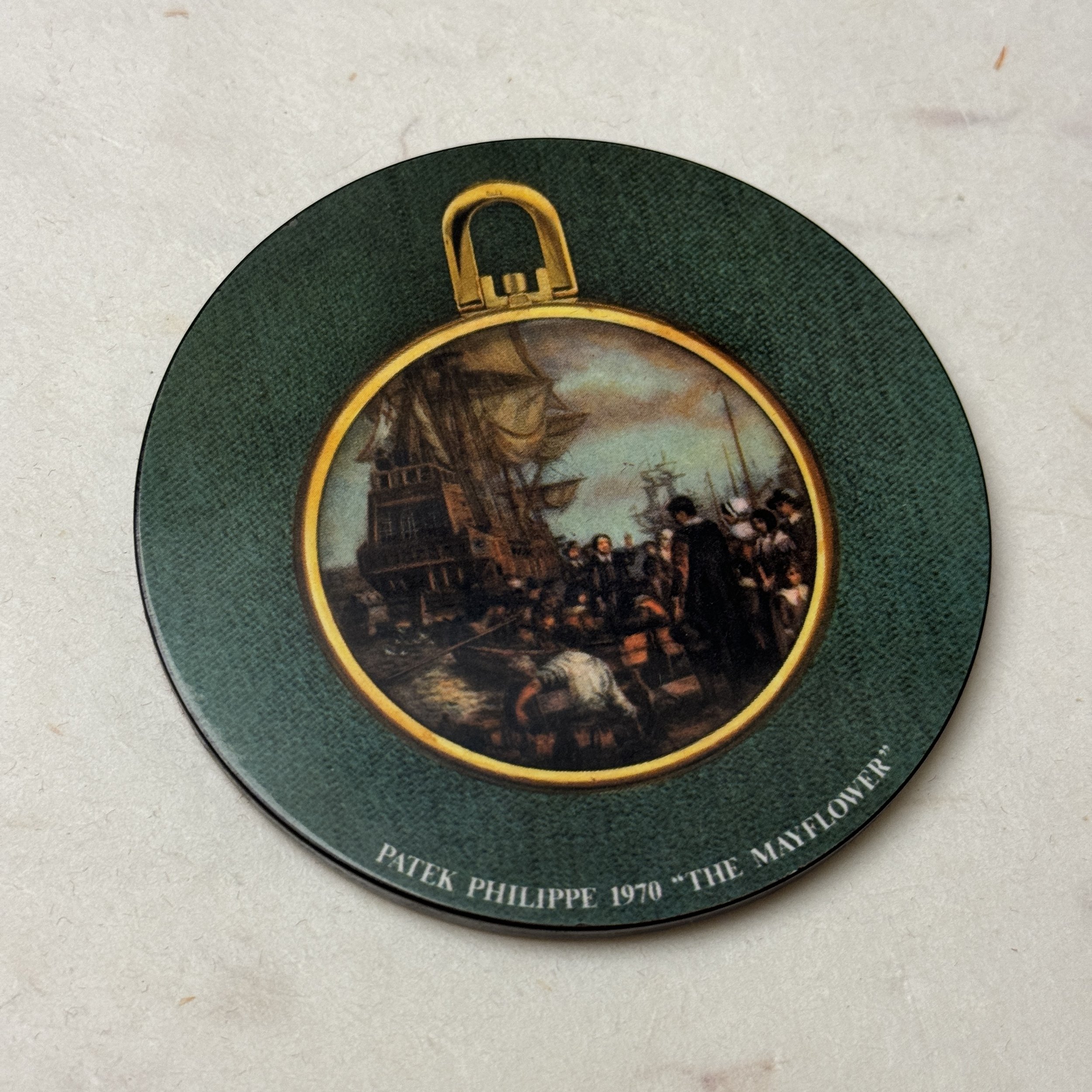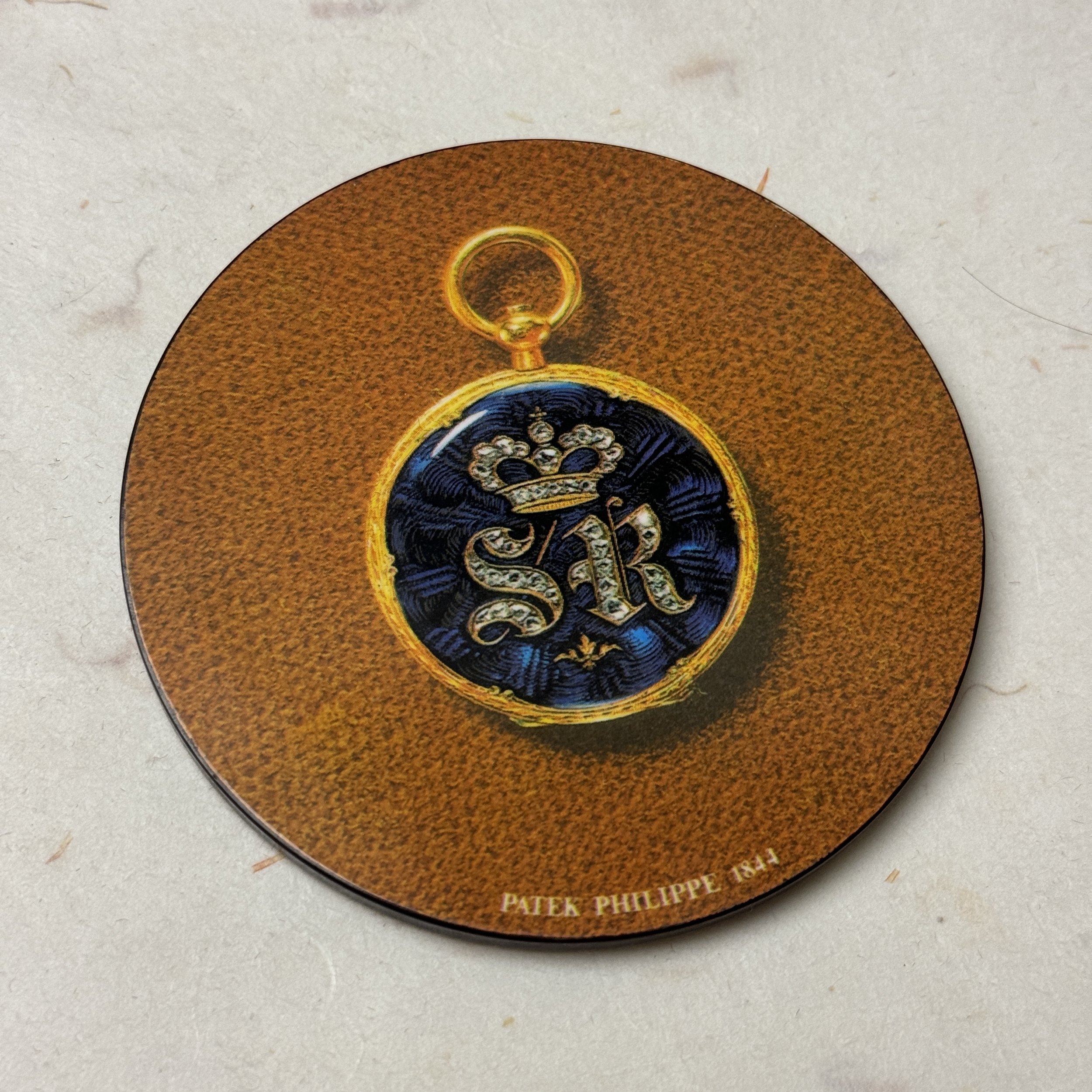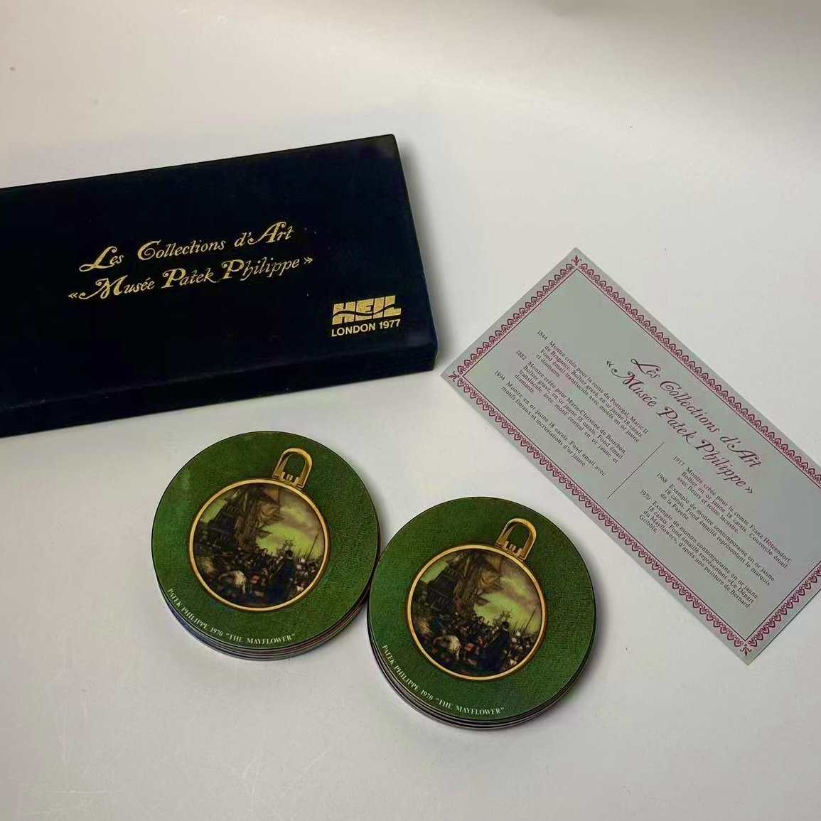This extremely rare set of six vintage coasters from the Art Collection of the Musée Patek Philippe, in collaboration with Whirlpool, features Extremely Rare (6) Musee Patek Philippe Les Collection d’Art Drink Coasters 1977 and is a true treasure for collectors and enthusiasts. Each coaster is crafted from wood and features intricate designs inspired by historic Patek Philippe pocket watches, reflecting the brand’s dedication to horological artistry. The coasters are preserved in their original fitted box, which also includes a note card detailing the rich history behind each design. The warm tones and detailed imagery on these coasters make them a sophisticated piece of art and a functional accessory. This set is a perfect gift for watch lovers and brand enthusiasts.
