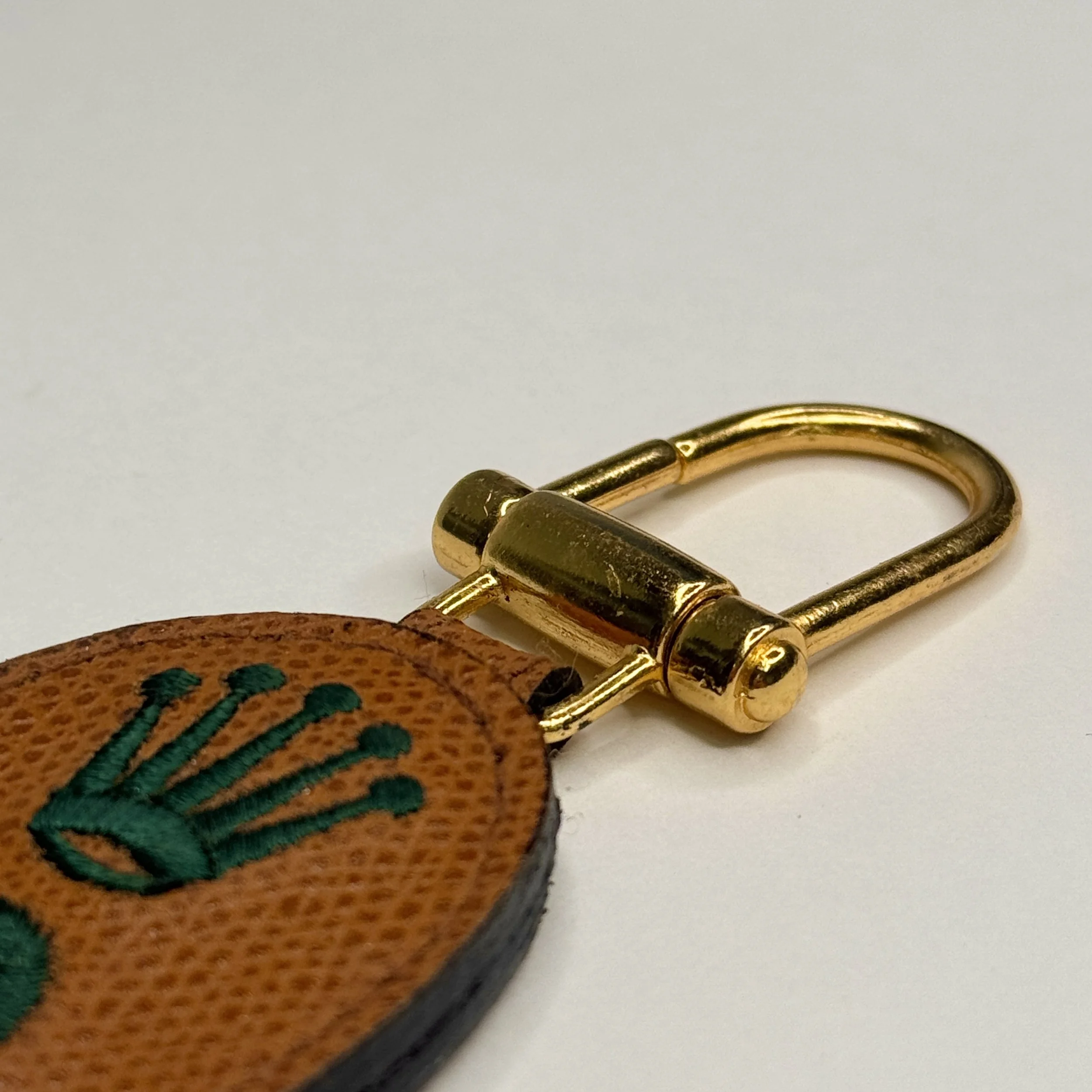 This Rolex Vintage Golden Crown Keyring 1990s is a refined novelty item crafted from richly textured brown leather and features the brand’s iconic green embroidered crown and “R” monogram. The oval leather fob is paired with a polished gold-tone metal D-ring clasp, designed for both durability and ease of use. The reverse side bears a subtle gold-stamped “Rolex” inscription, affirming its authenticity. A perfect blend of luxury and functionality, this piece serves as a collectible accessory for aficionados of the Rolex heritage.