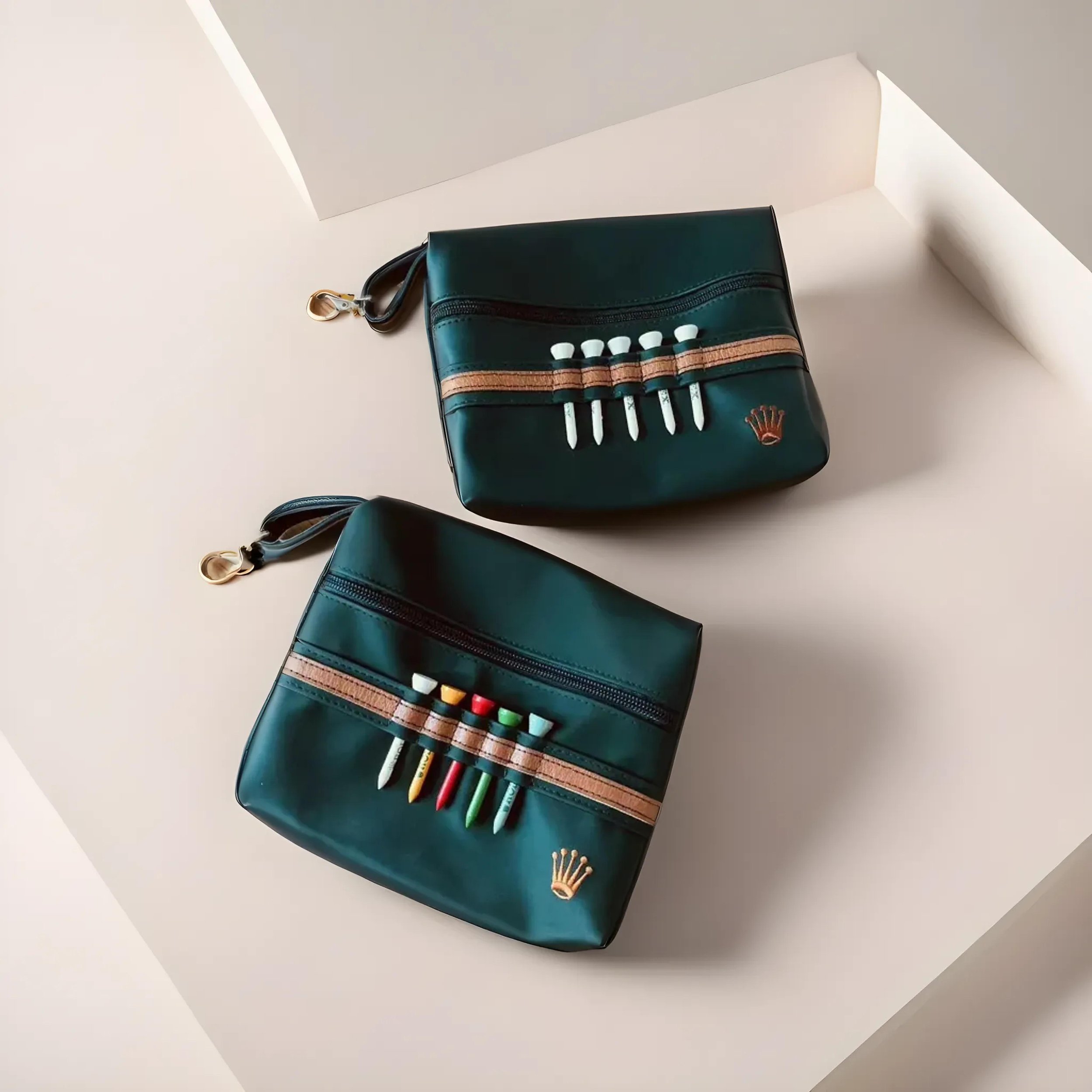 Elevate your game with the Rolex Golf Travel Set, a symbol of sophistication on the green.Inside, you’ll find five precision-crafted golf tees, each designed to offer optimal performance and style. The tees are neatly presented against a brown decorative stripe, adding a classic touch to the set.