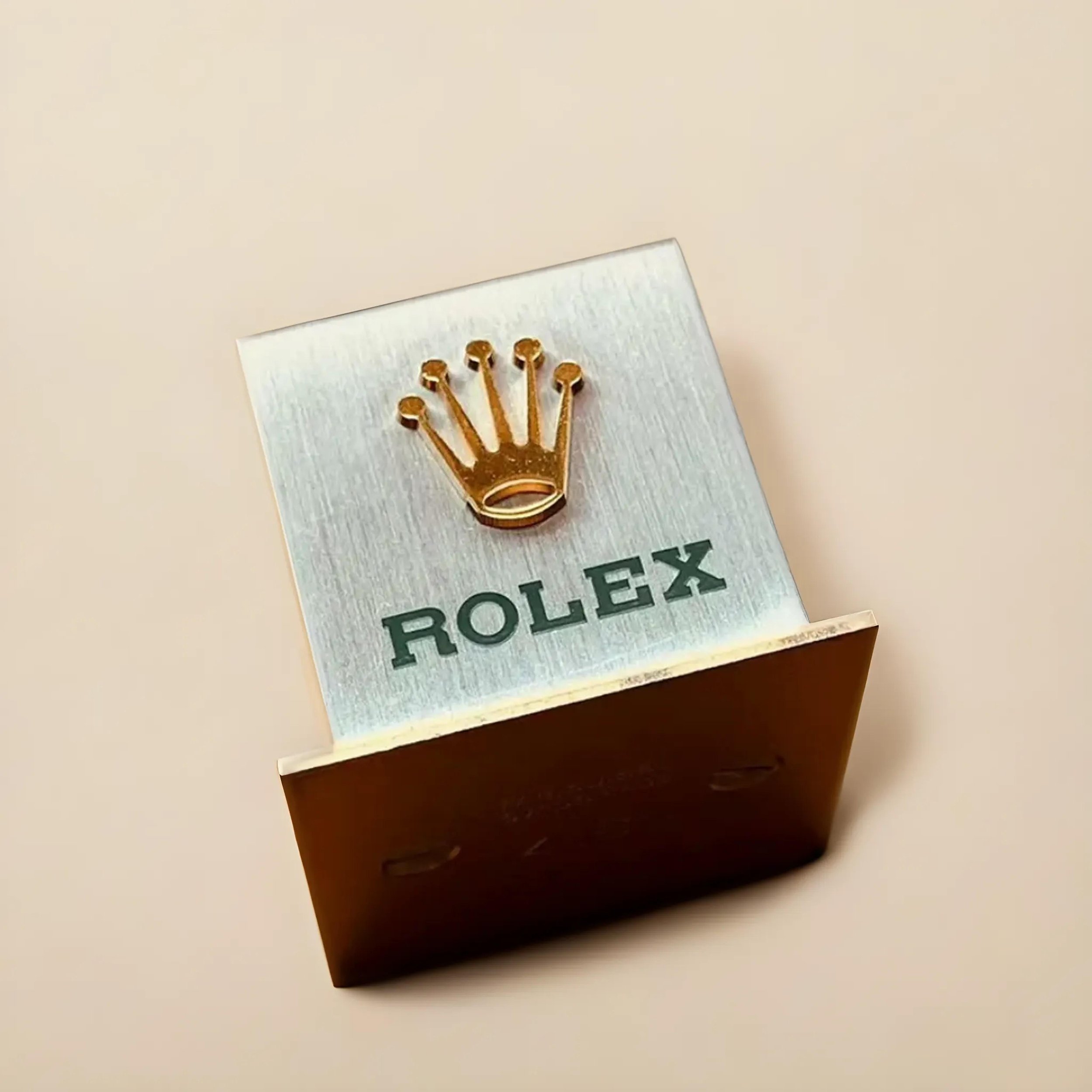 Step into the world of luxury timekeeping with this Rolex Vintage Watch Stand, a classic piece from the illustrious brand’s dealer displays. Crafted from robust metal and finished with Rolex’s signature green enamel, this stand features the iconic crown logo, symbolizing the apex of watchmaking prestige. Stamped with “Swiss Made,” representing a slice of Rolex’s rich heritage.