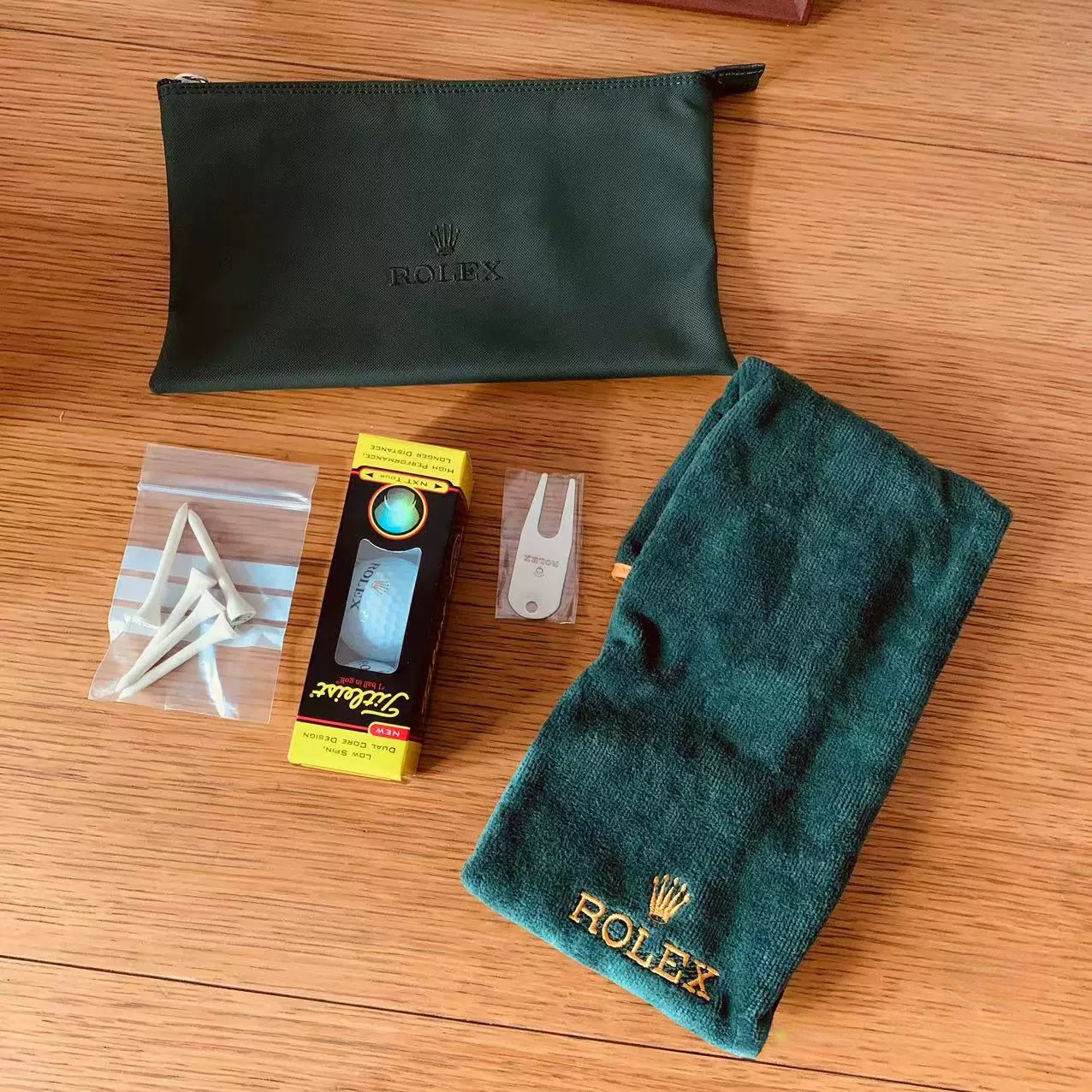This Rolex Golfer’s Companion Set is the perfect fusion of luxury and sport. Designed for the golf enthusiast with a taste for the finer things, the set includes essential golfing accessories such as tees and markers, each adorned with the Rolex logo for a touch of elegance. Packaged neatly in a sophisticated green pouch with a matching towel, these accessories combine functionality with the distinctive style of the Rolex brand.